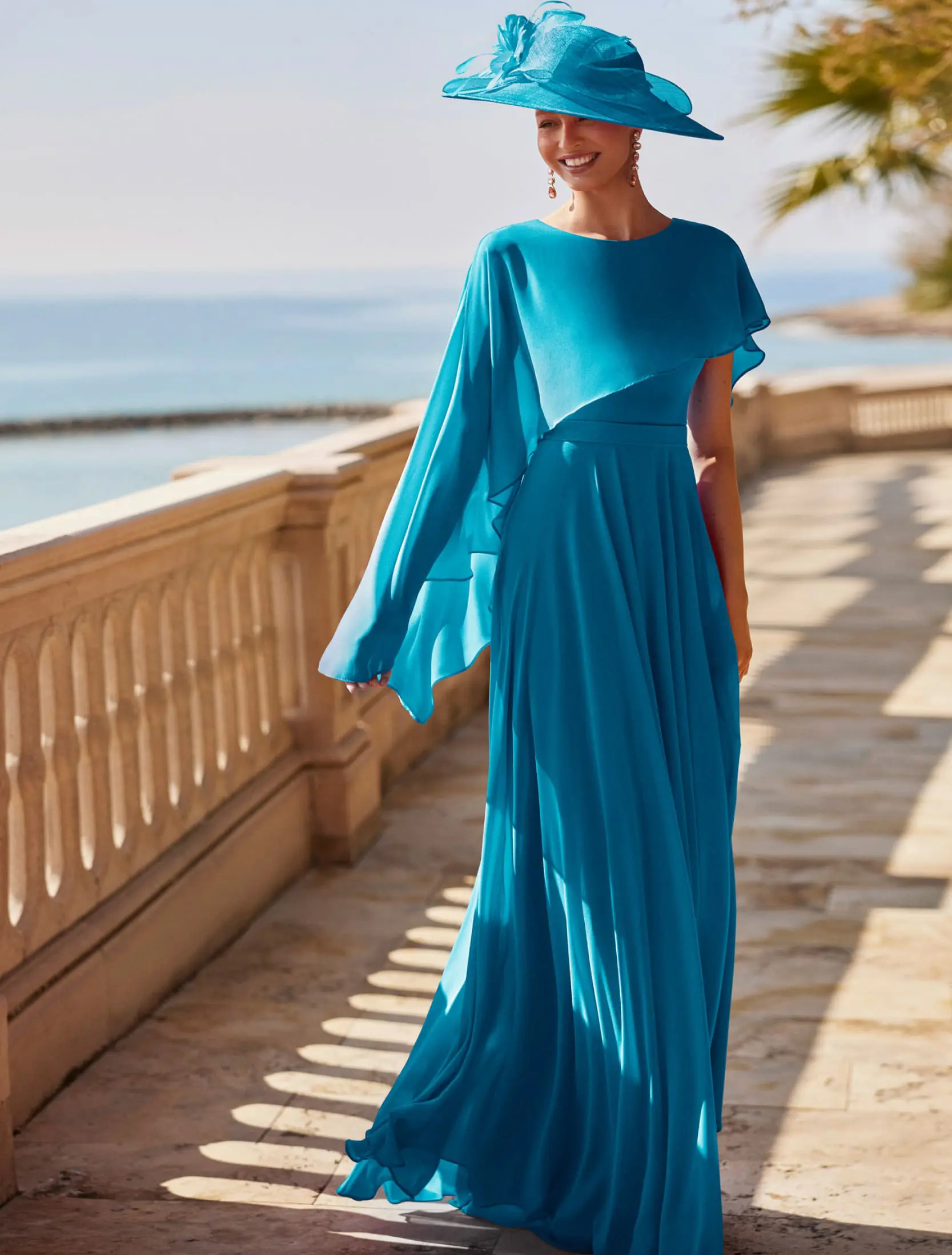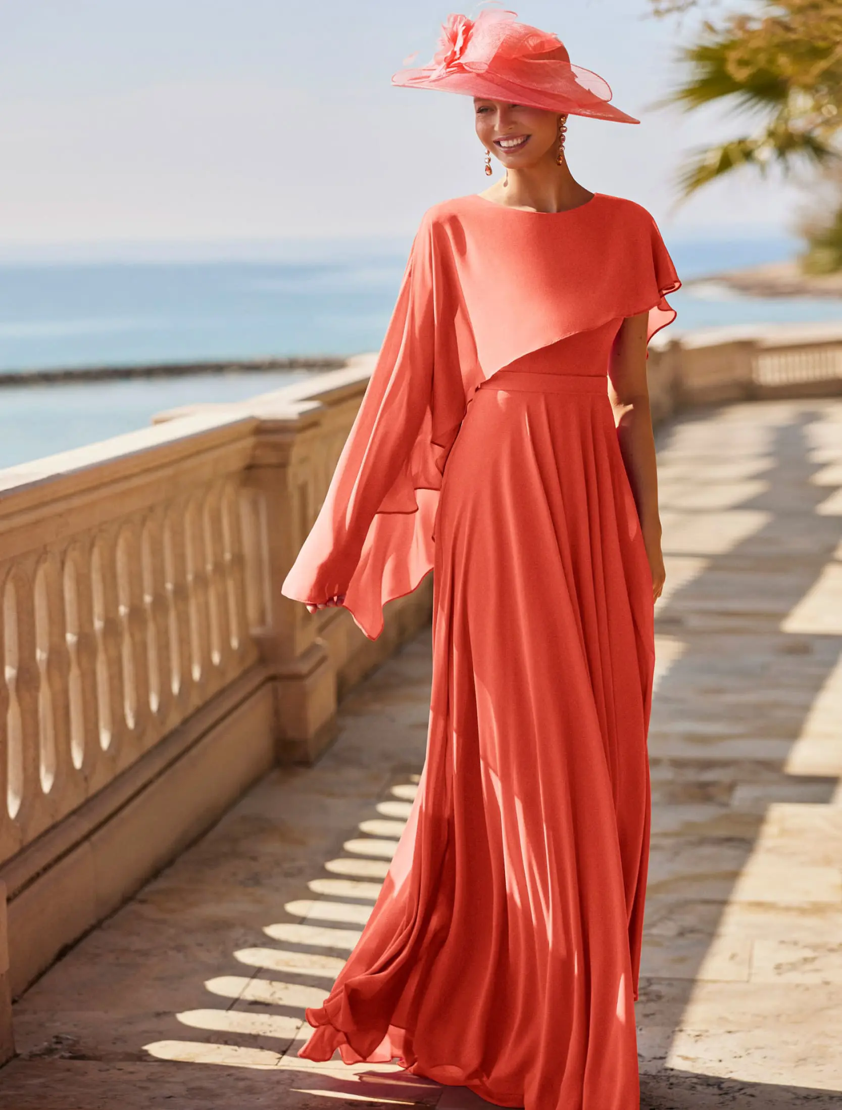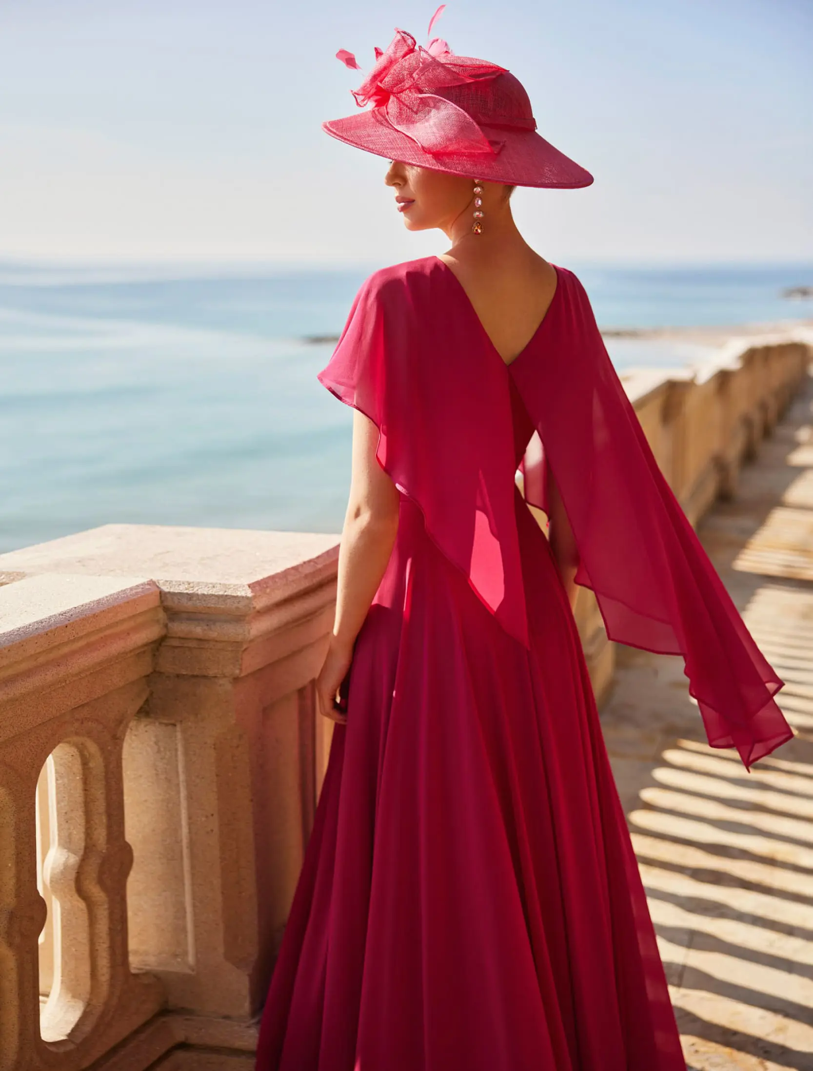 Robe de soirée longue, confectionnée en mousseline. Cette robe sans manches arbore un dos en V. Le modèle est complété par une courte cape. Un ensemble Couture Club.