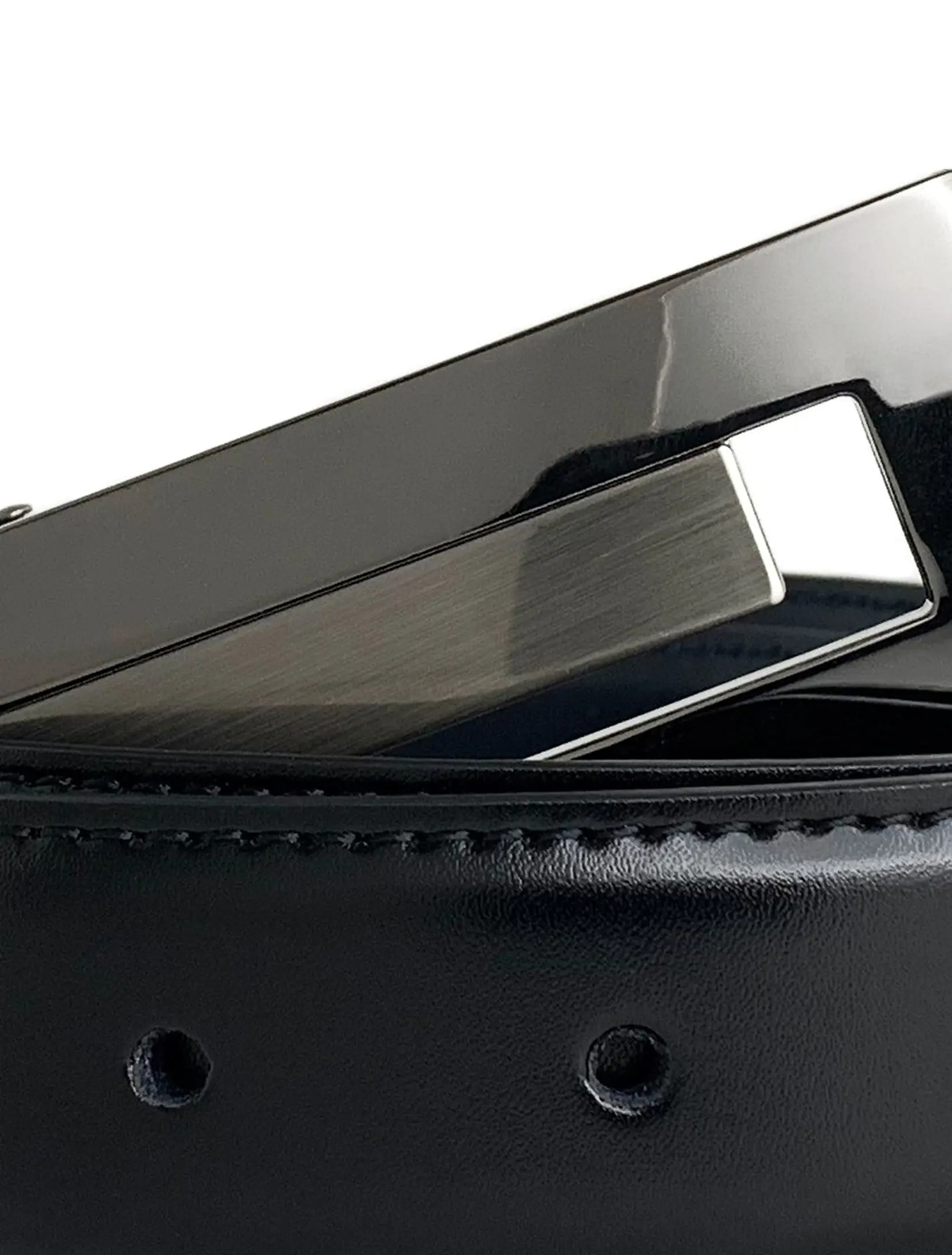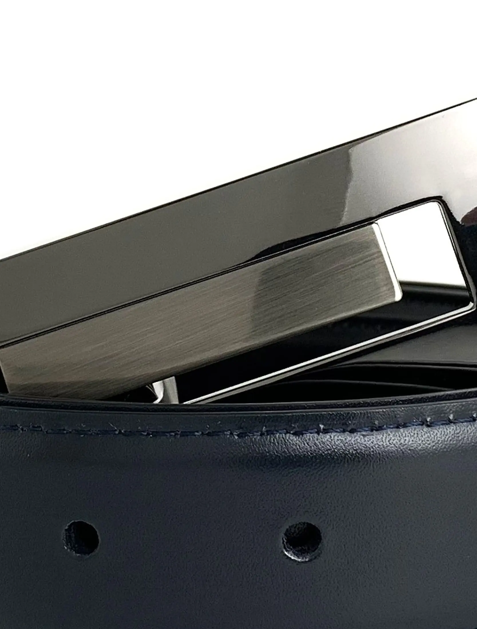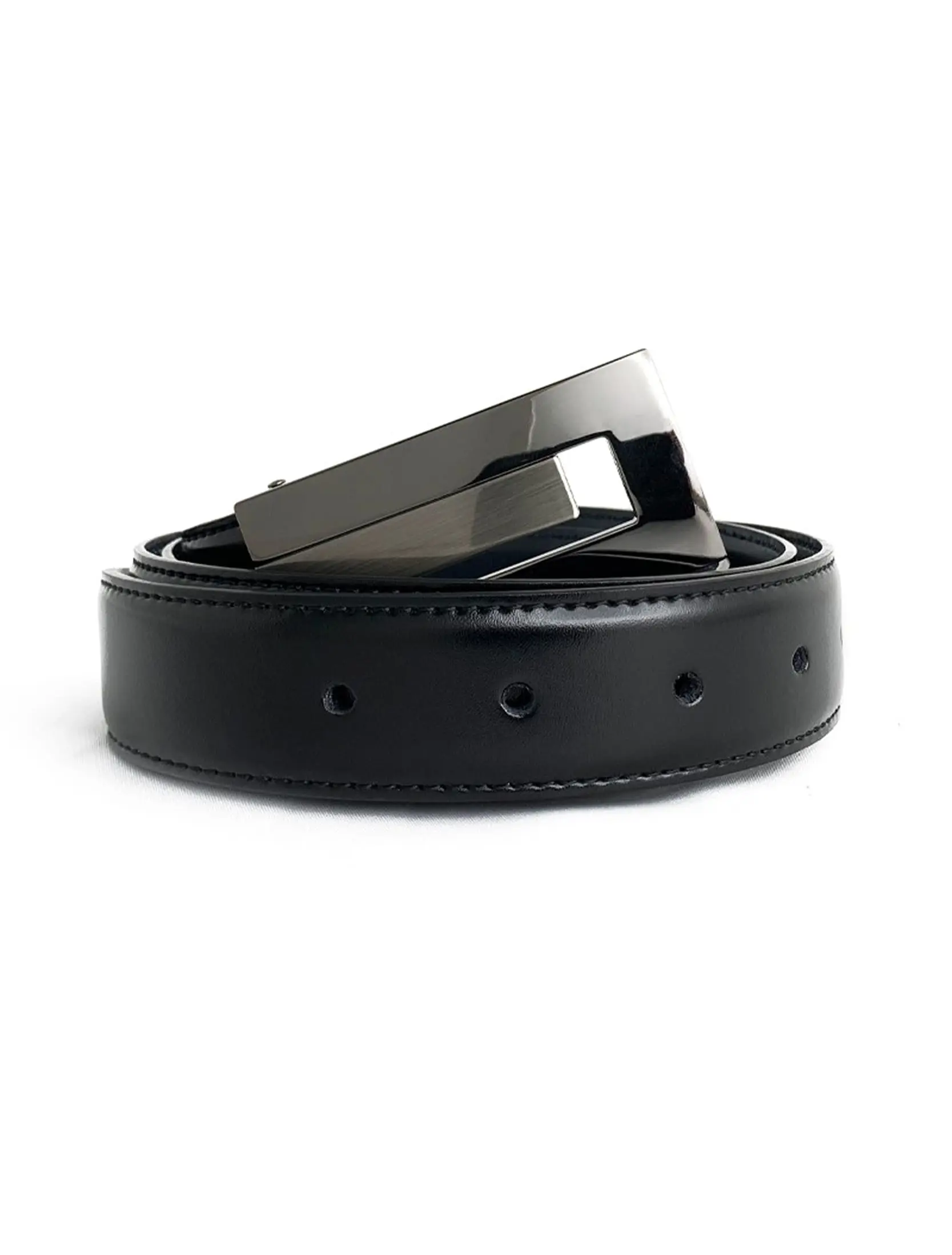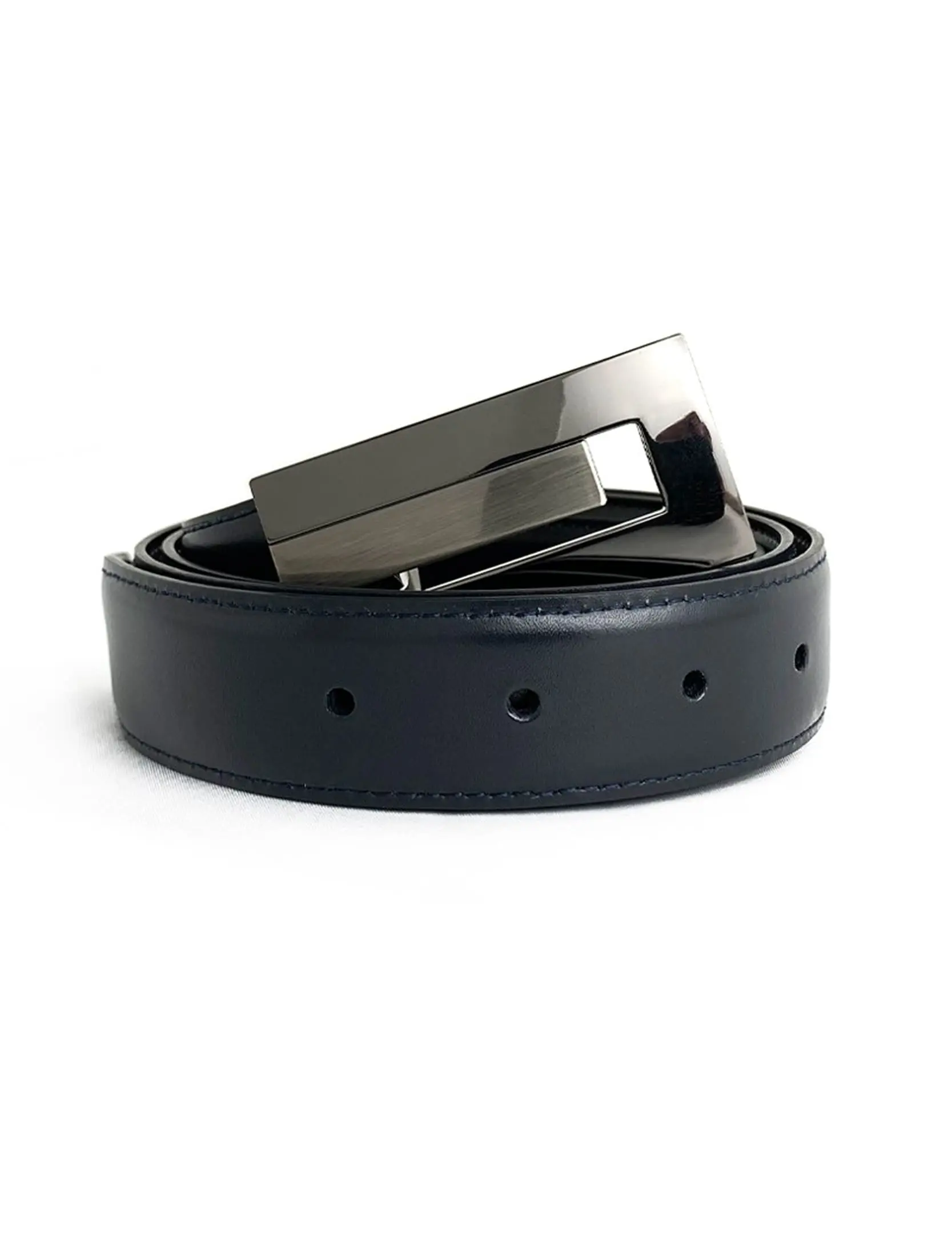 Ceinture en cuir réversible noir/gris, ajustable. Boucle pleine ajourée. Tailles disponibles : 110 cm ou 130 cm.