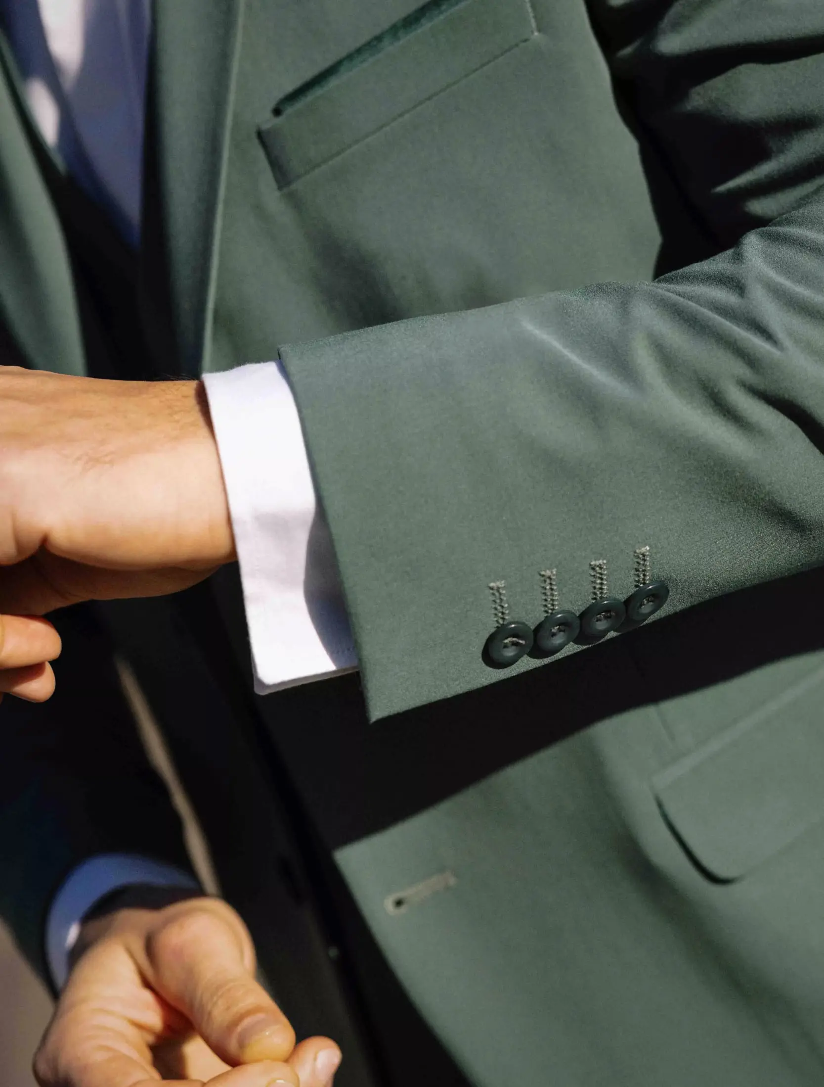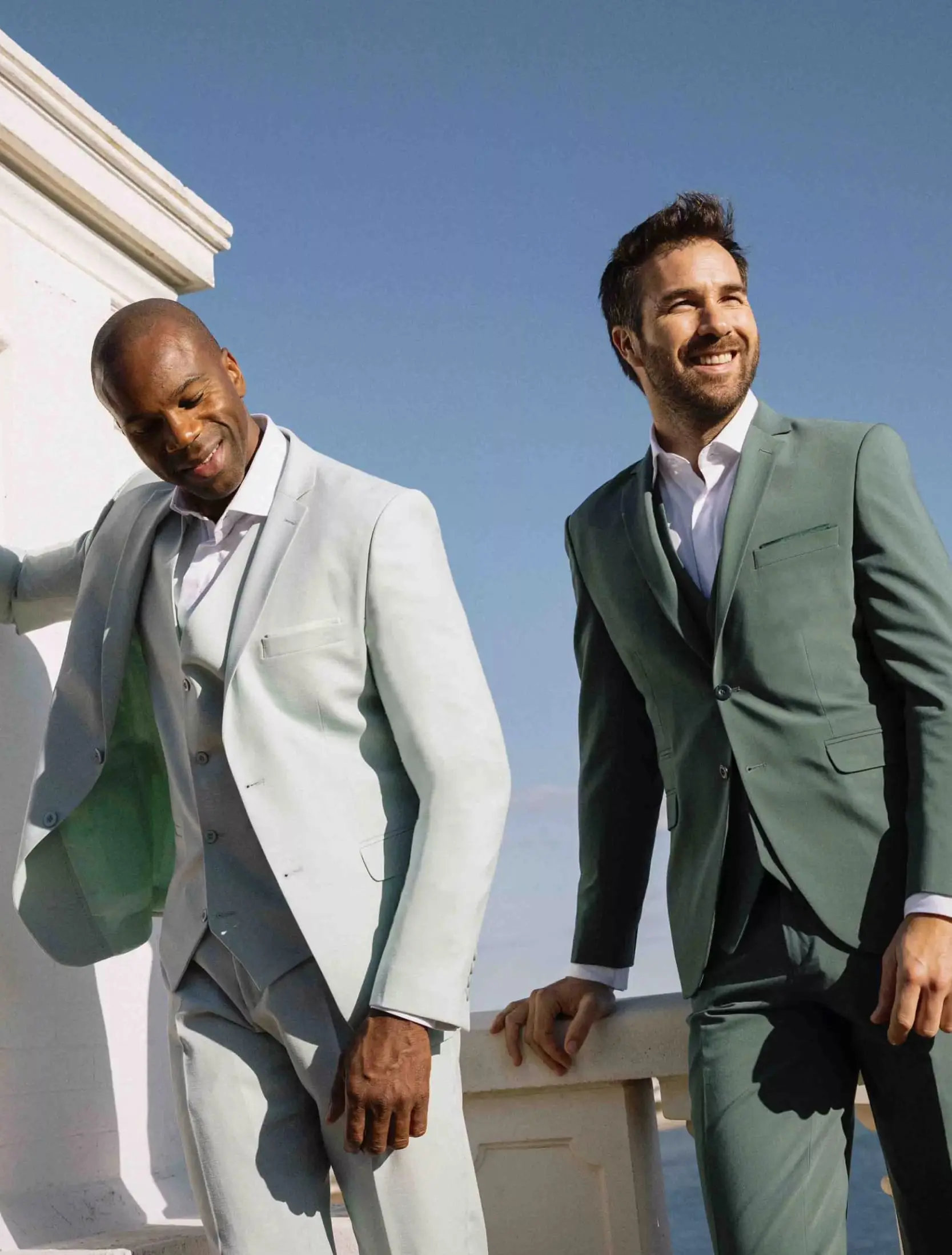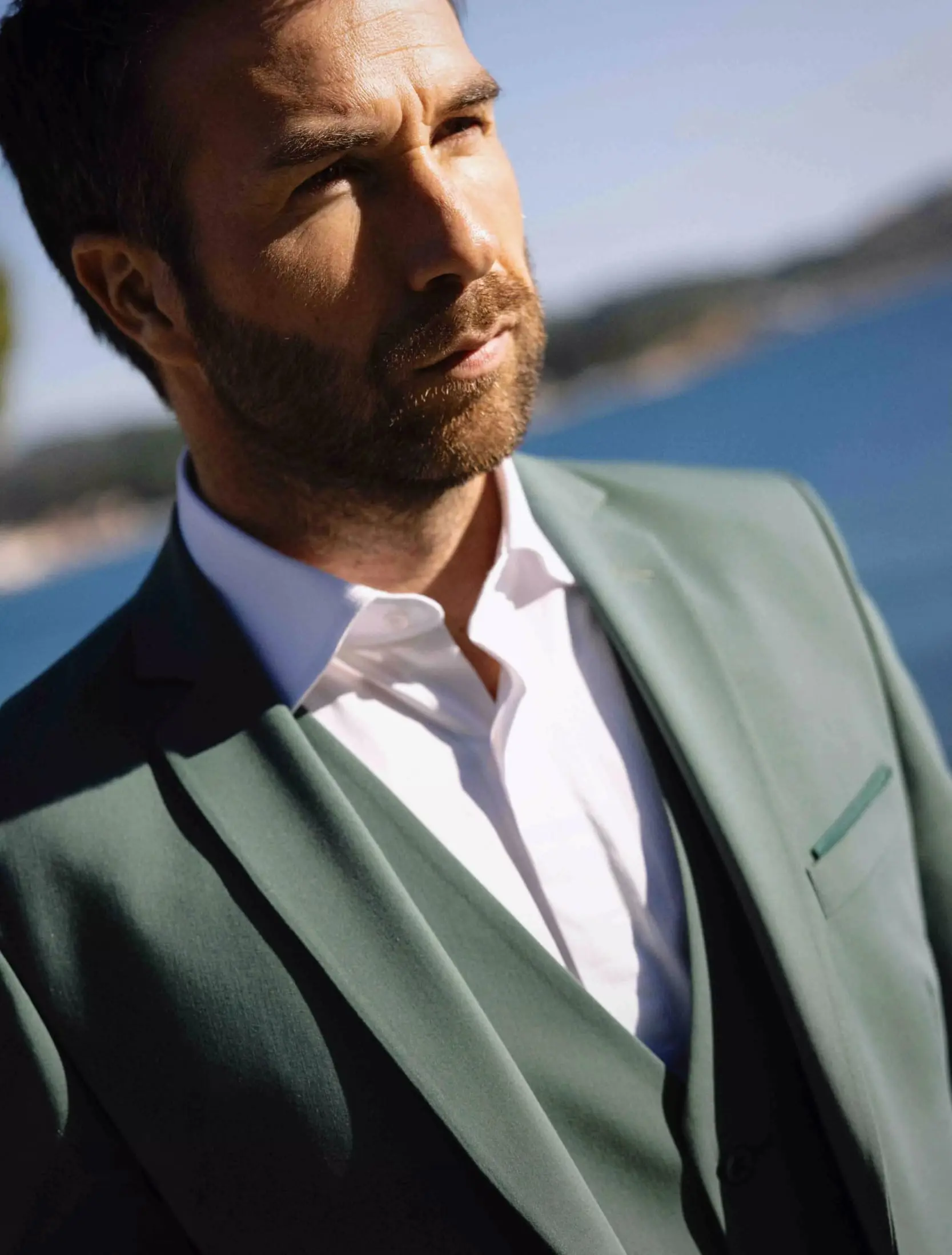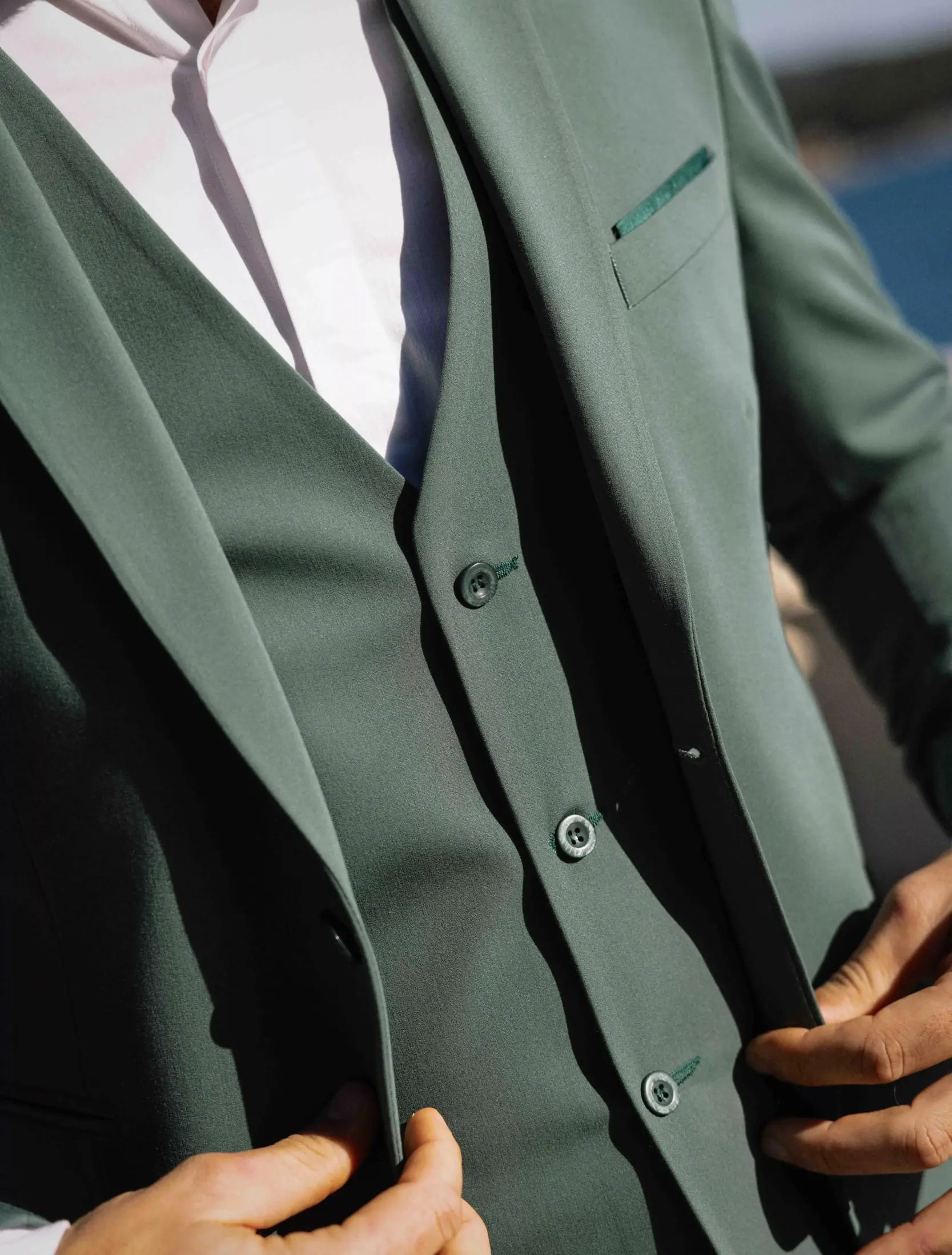 Ensemble 3 pièces : Veste, Gilet, Pantalon. Veste col cranté à 2 boutons, gilet droit 4 boutons.