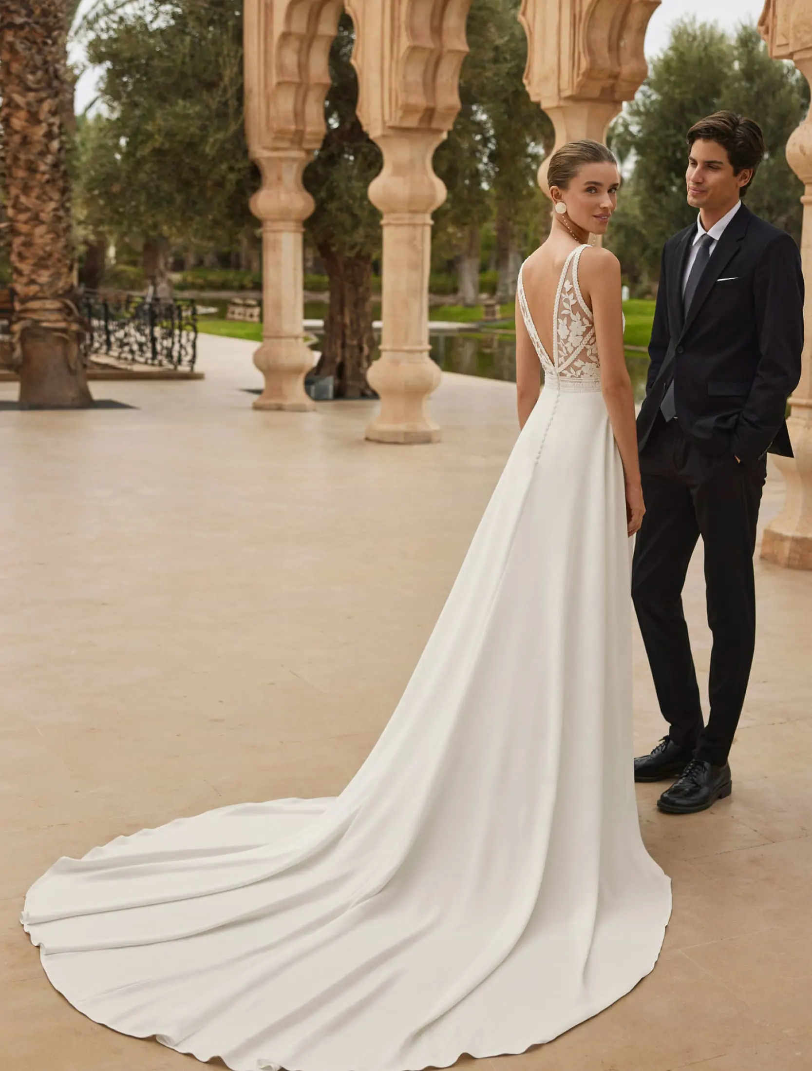 Robe de mariée longue, coupe ligne A. En crêpe élastique avec corsage en dentelle et perles, décolleté plongeant, dos en V et jupe fendue latéralement — une silhouette sensuelle et fluide.