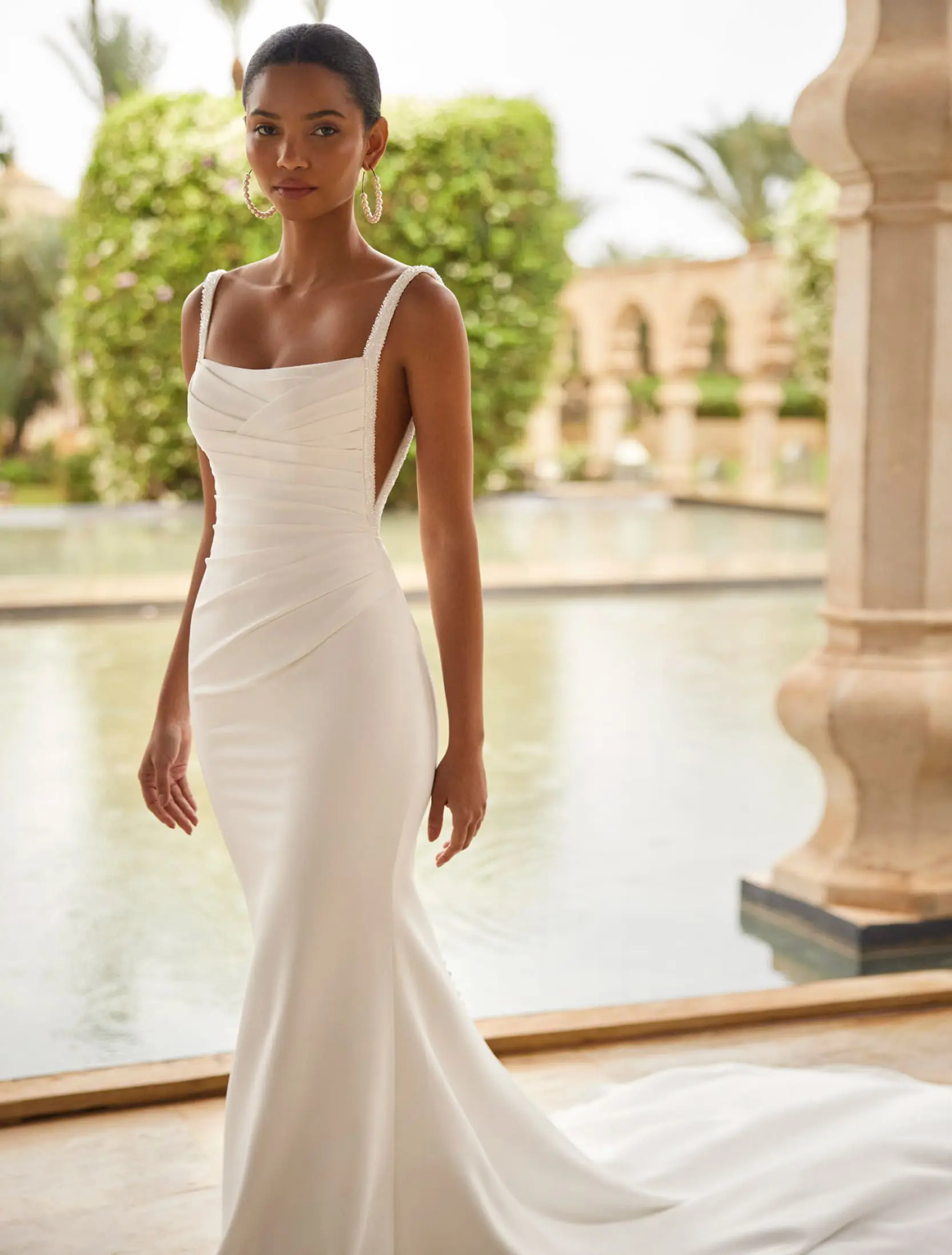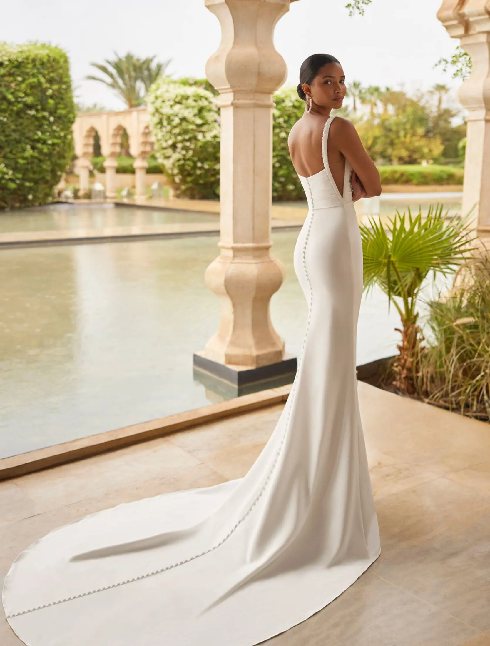 Robe de mariée longue, coupe sirène. En crêpe bi-extensible avec un décolleté carré, des bretelles perlées et un dos ouvert — une allure raffinée et contemporaine.