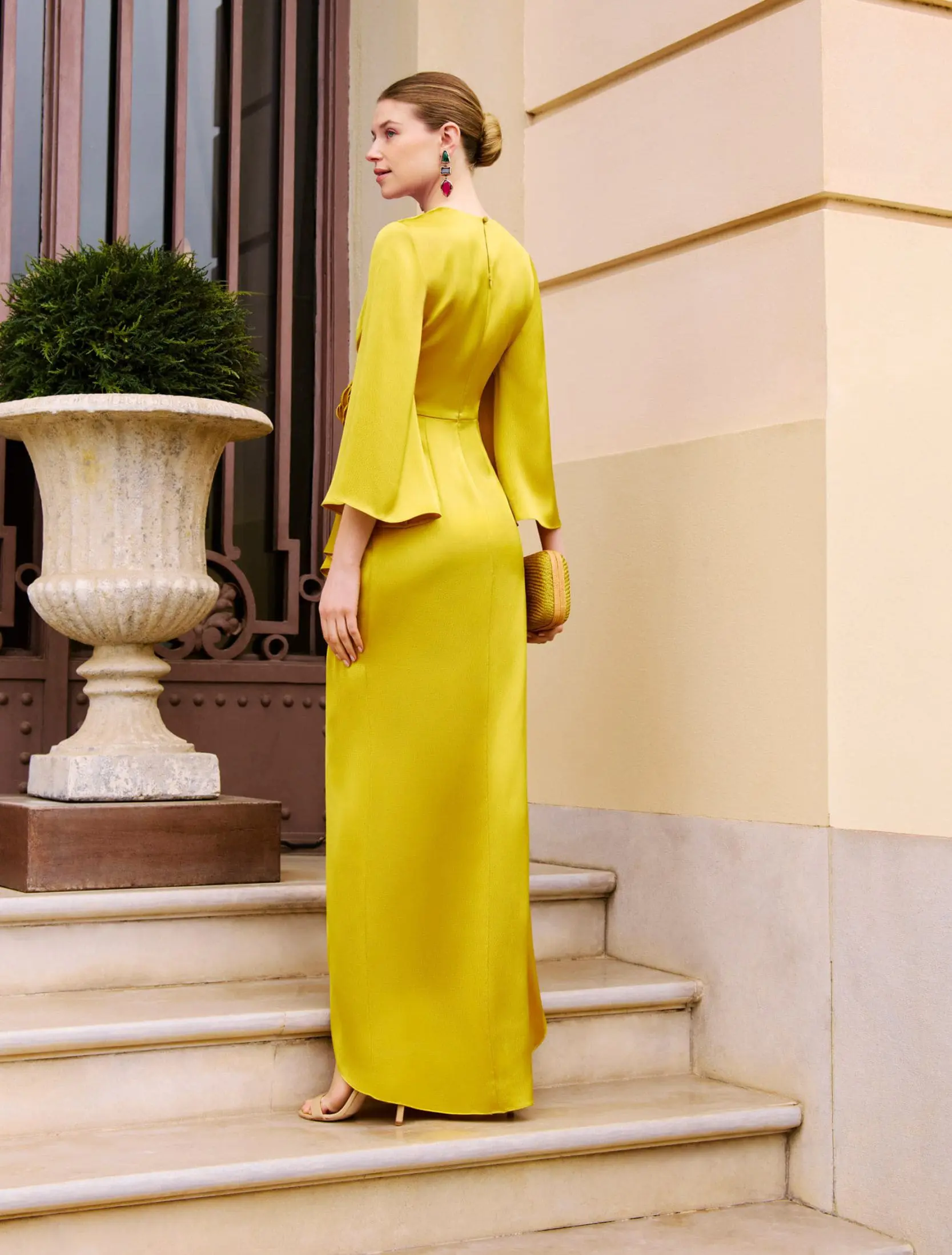 Robe de soirée coupe high-low en satin texturé, dotée d’un décolleté en V, de manches françaises et d’un dos fermé.