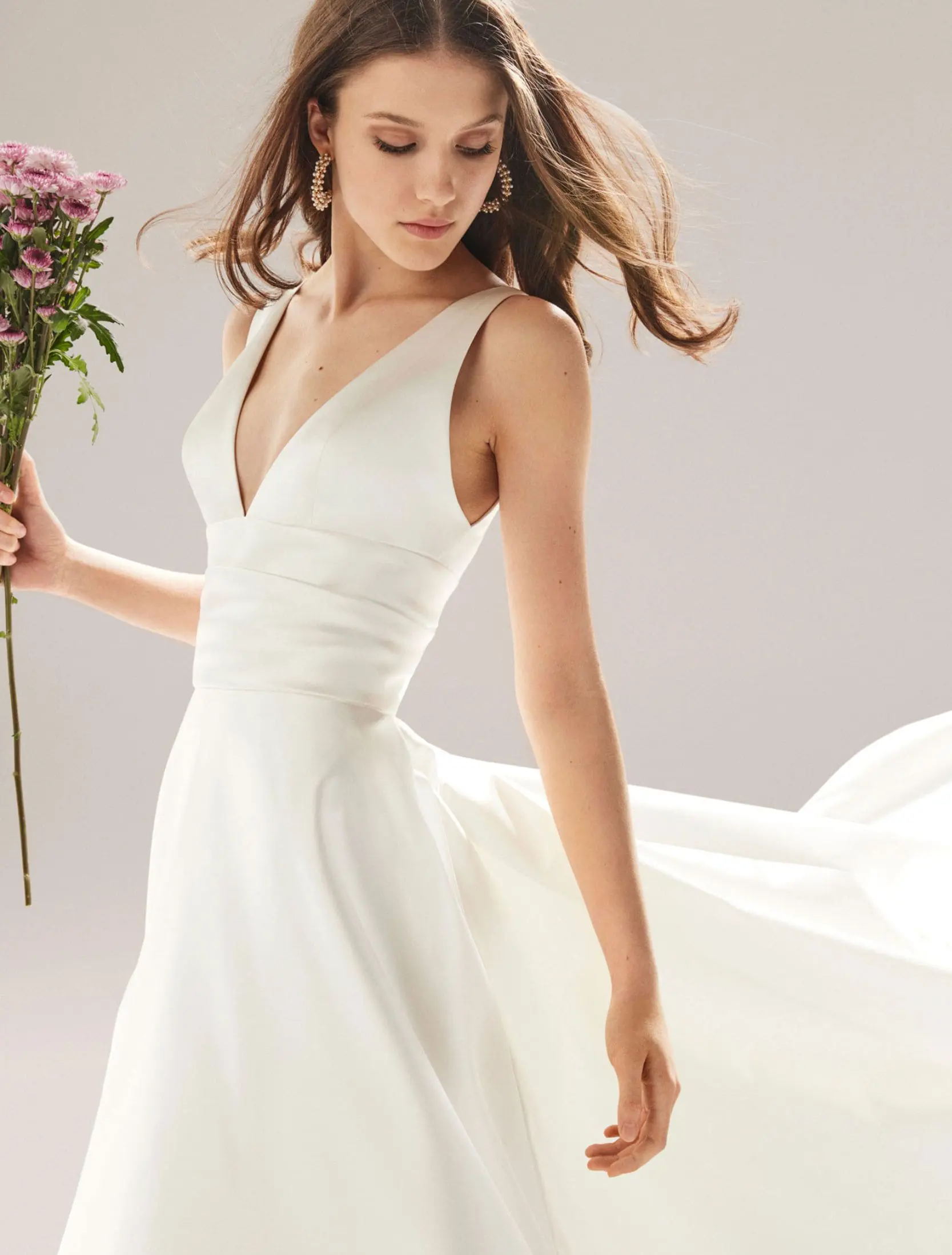 Robe de mariée évasée en satin, avec corsage et jupe soulignés d’une ceinture drapée.