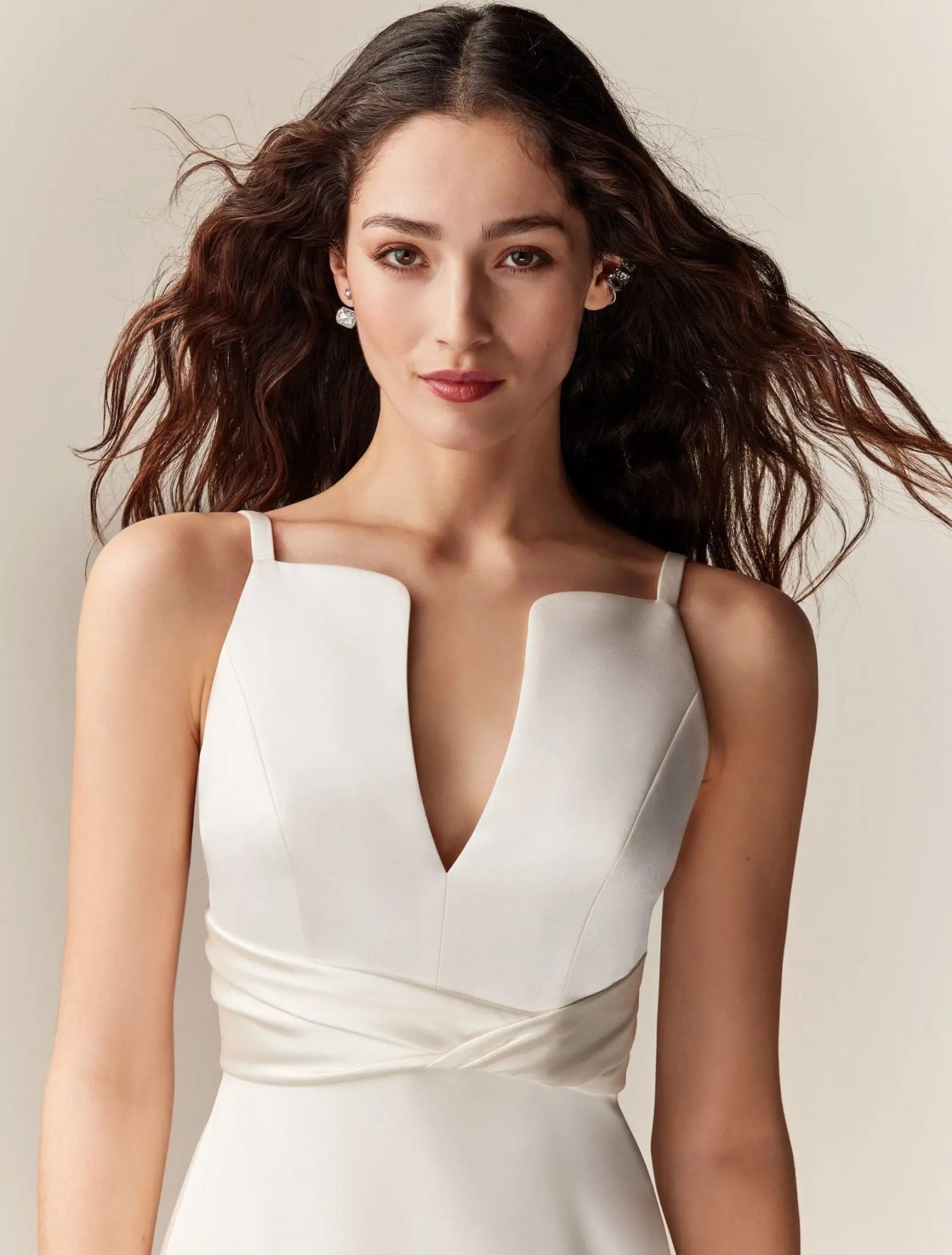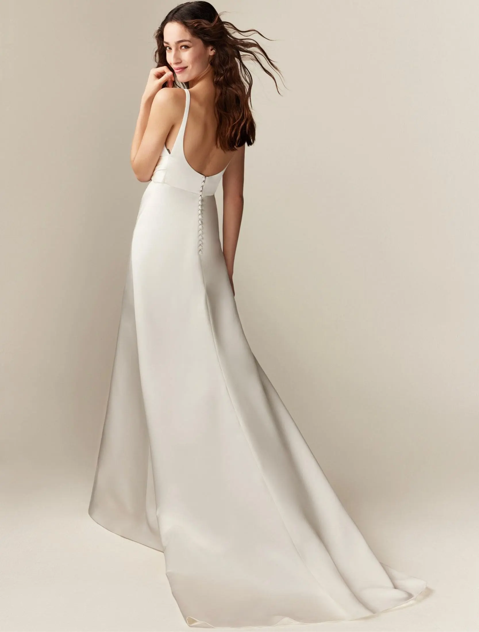 Robe de mariée évasée en satin New Angel, avec décolleté en forme de feuille et ceinture drapée à la taille.