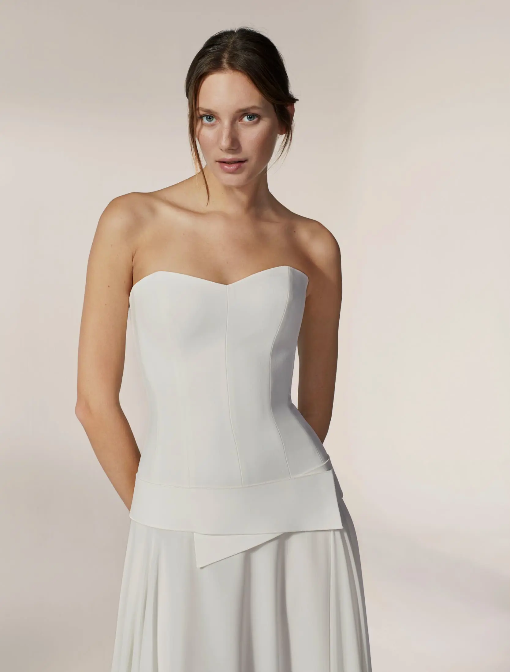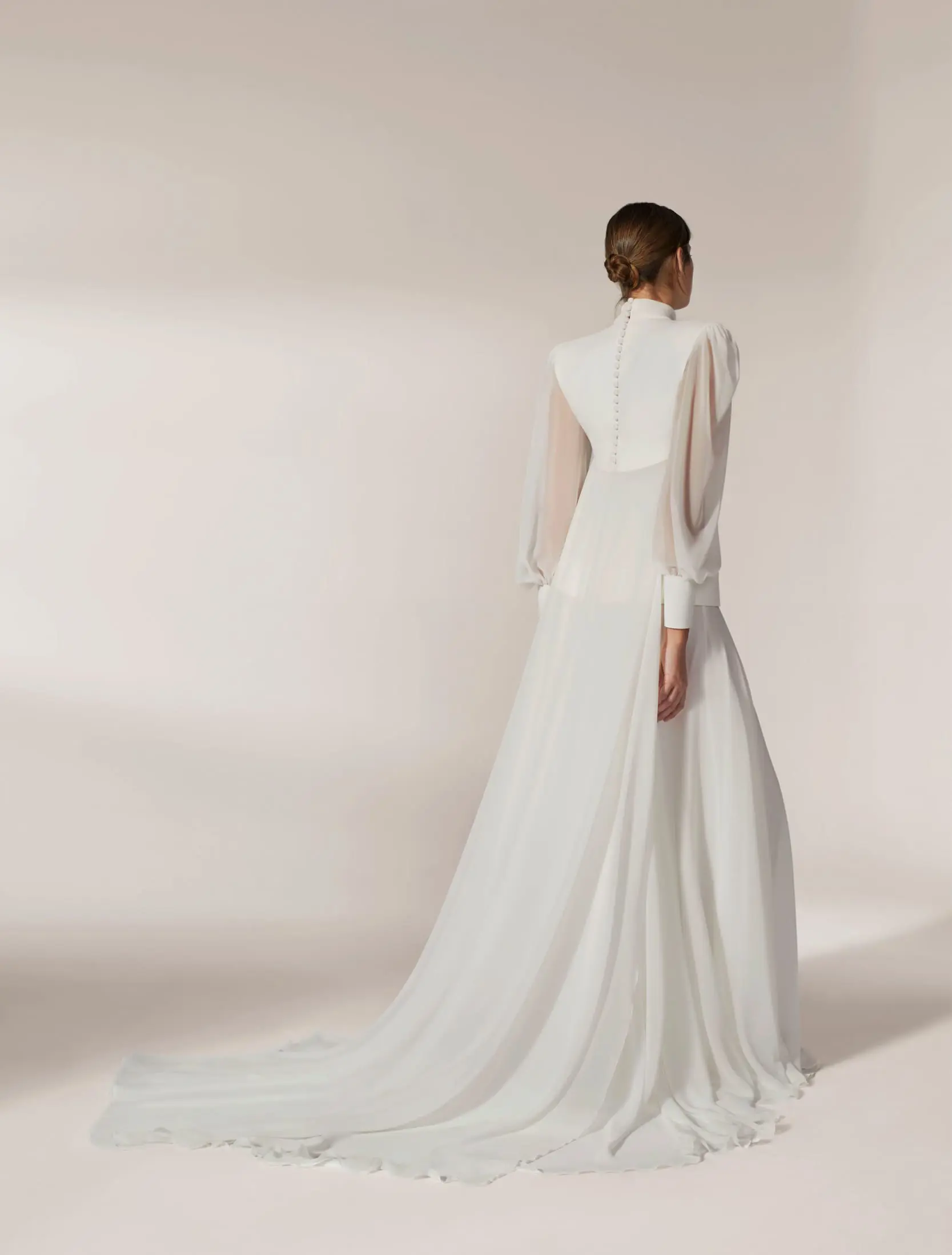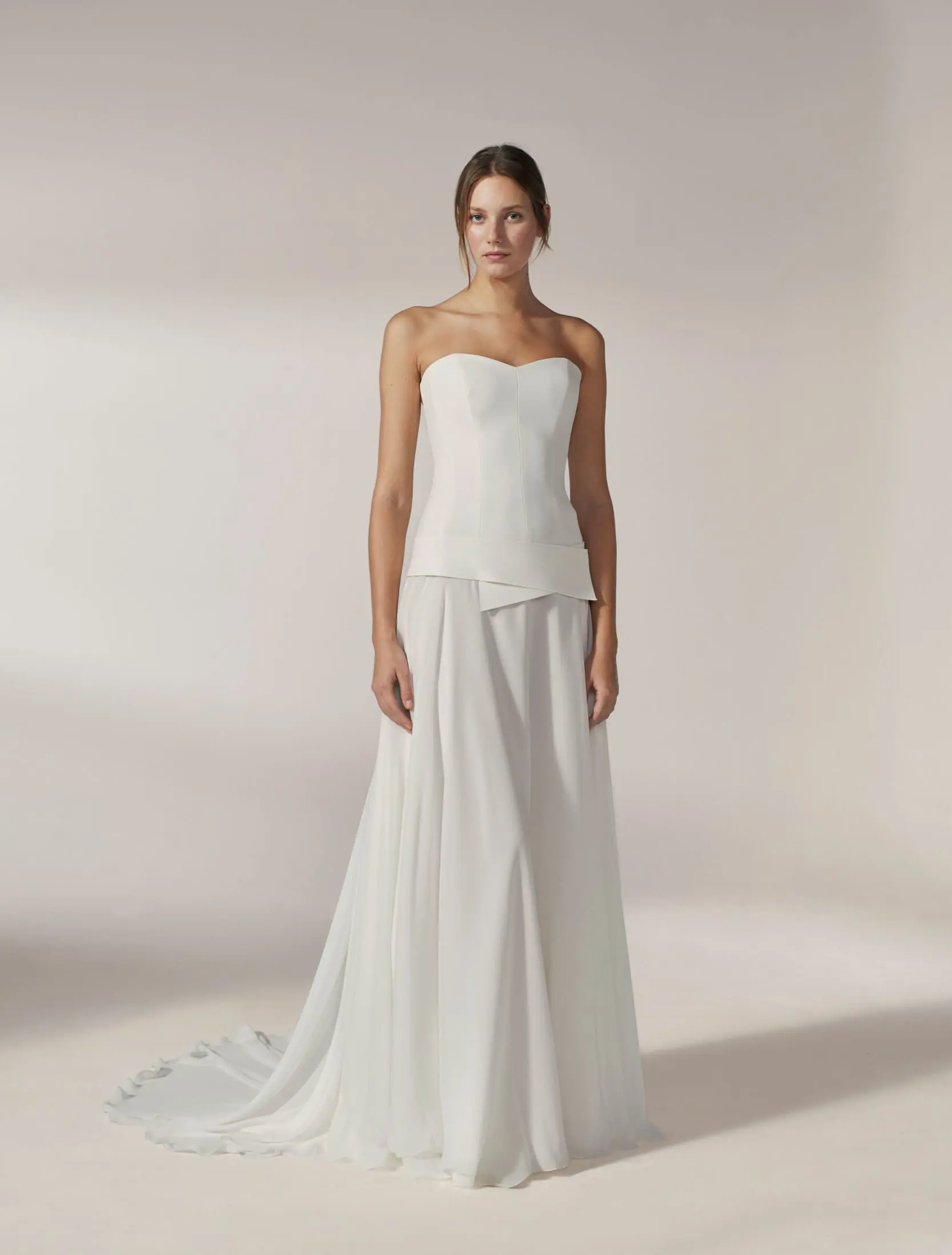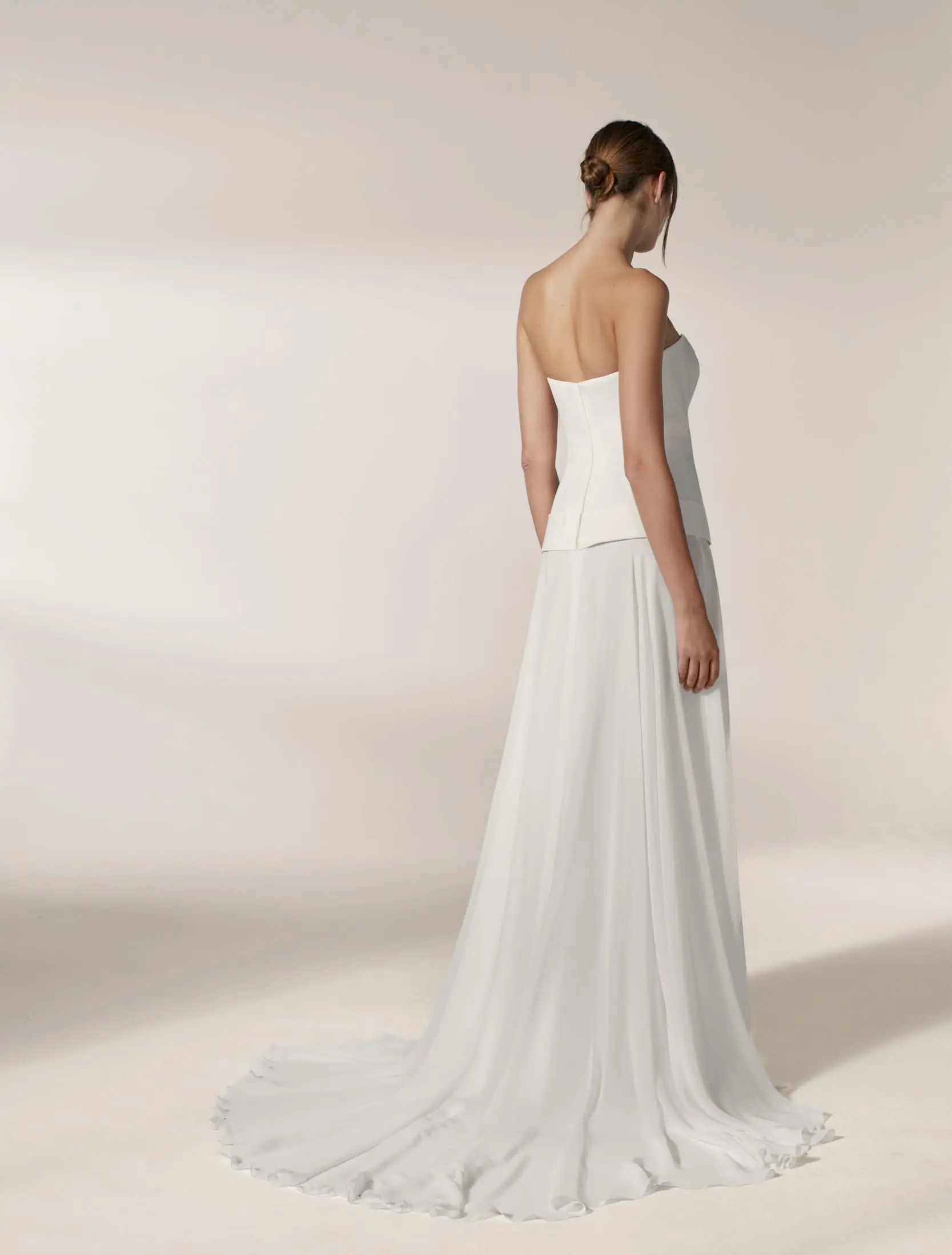 Ensemble de robe sans bretelle, hanche basse avec ceinture, jupe cape en mousseline. Complété par des épaulettes et emmanchures en crêpe, avec cape et manches en mousseline.
