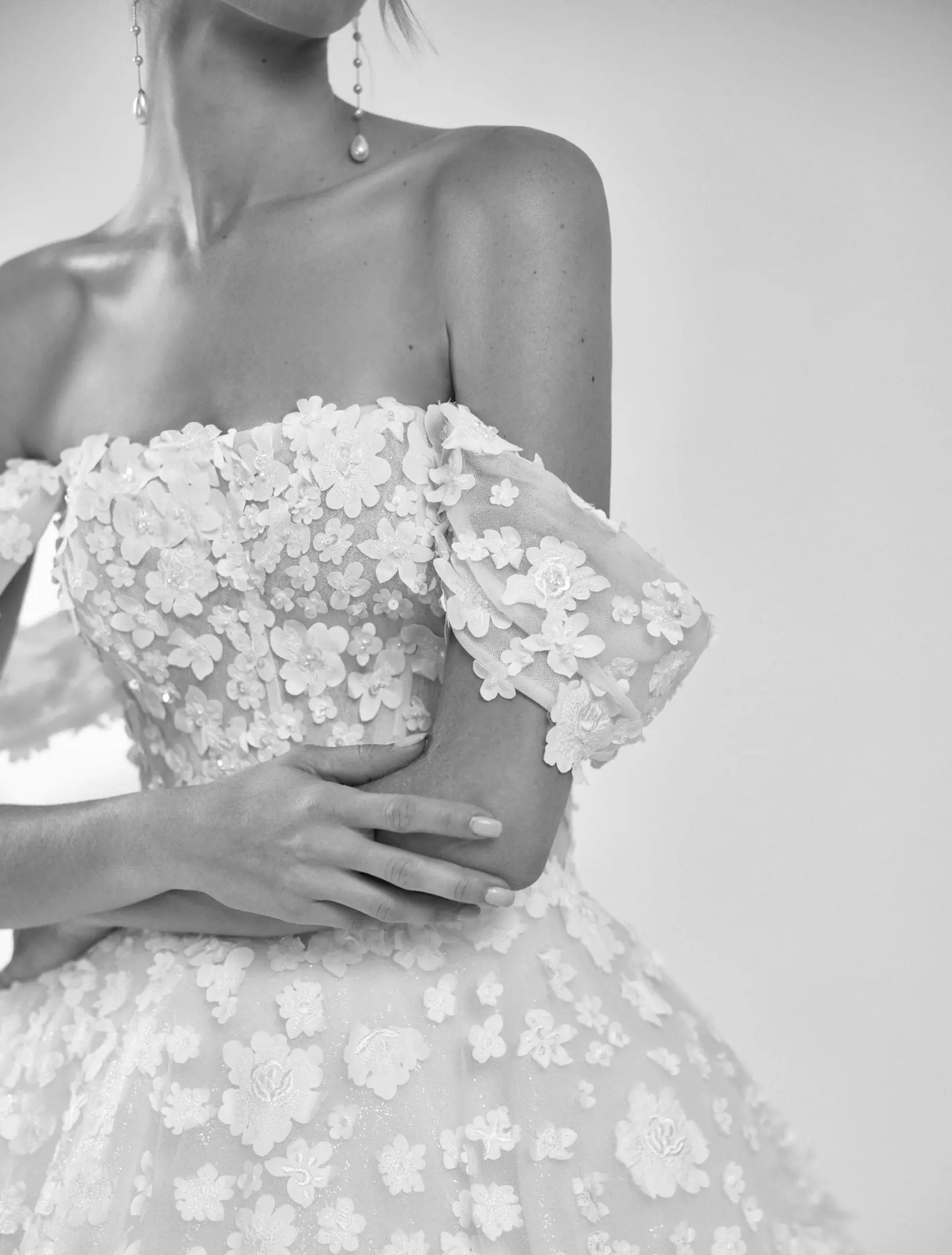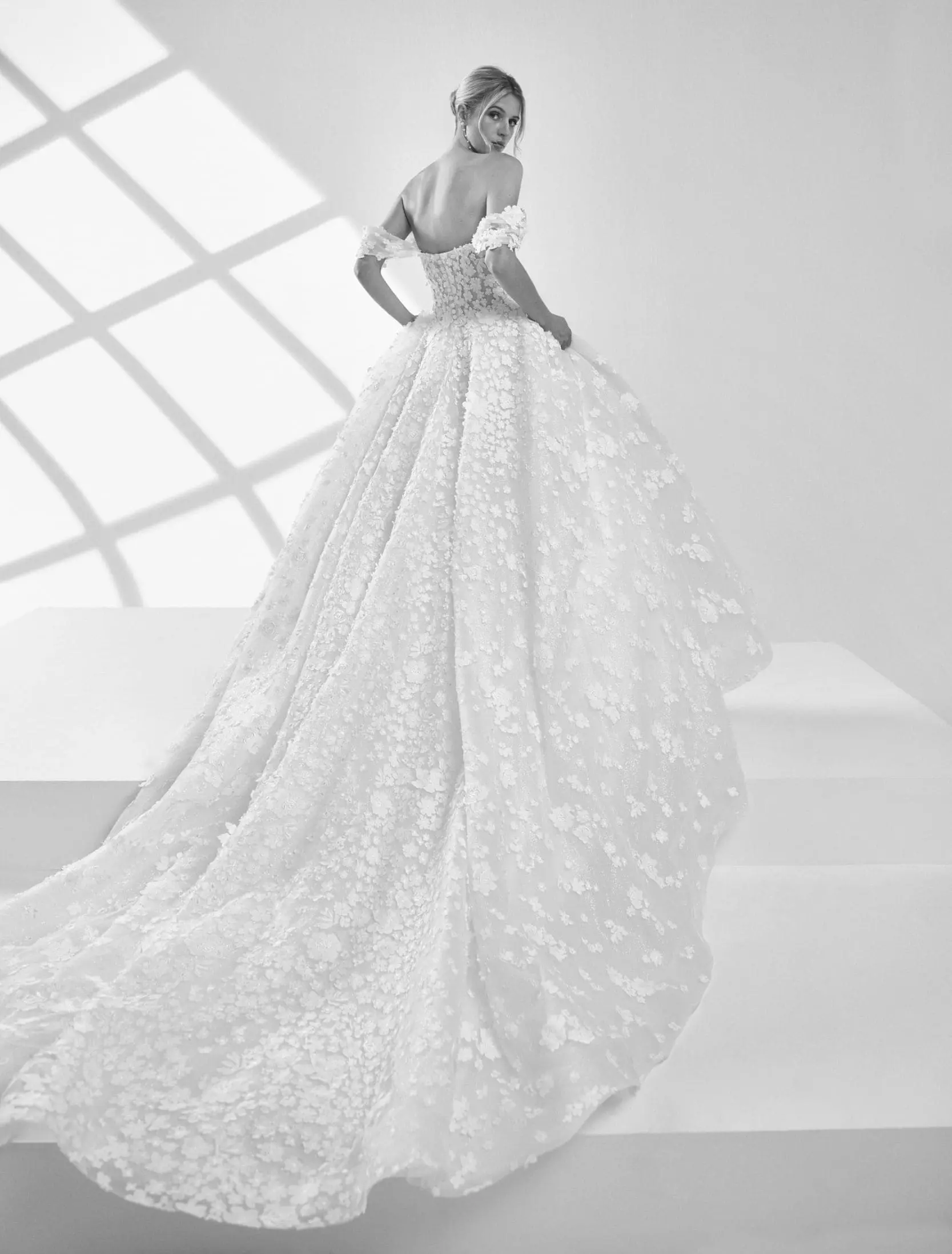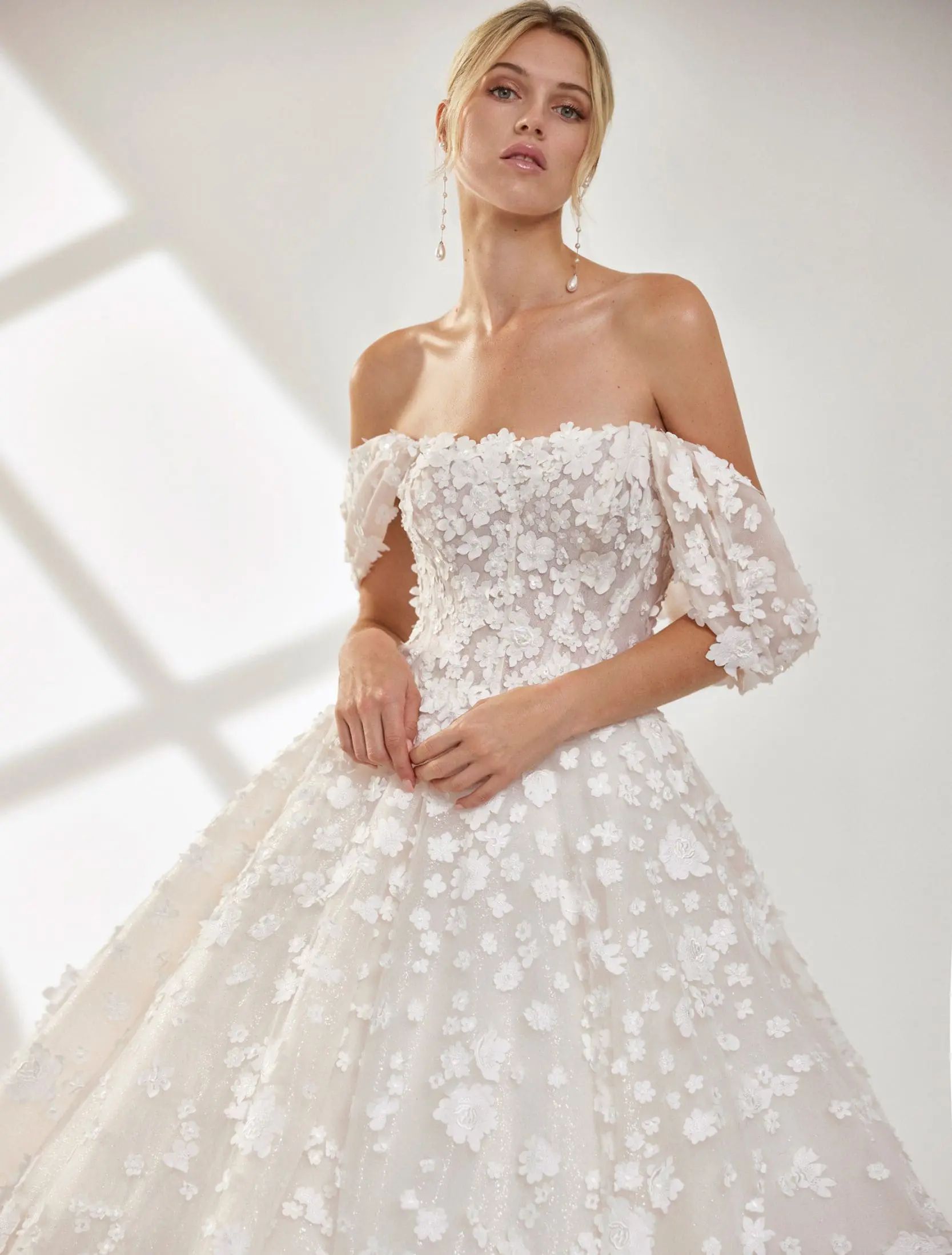 Robe de mariée longue princesse en tulle pailleté, avec encolure bustier, bretelles amovibles et dos ouvert, pour une allure féerique et raffinée.