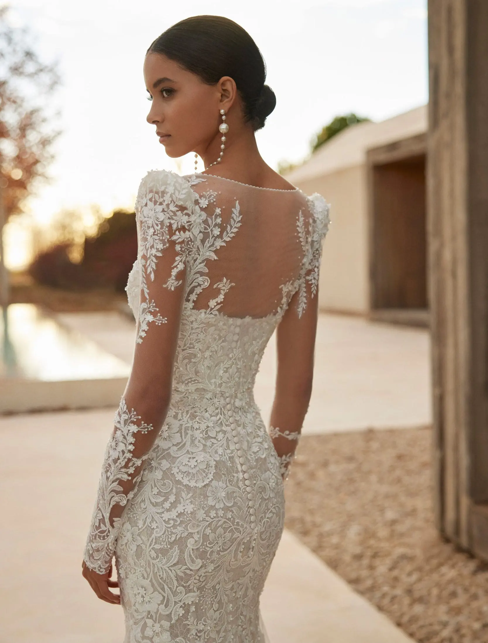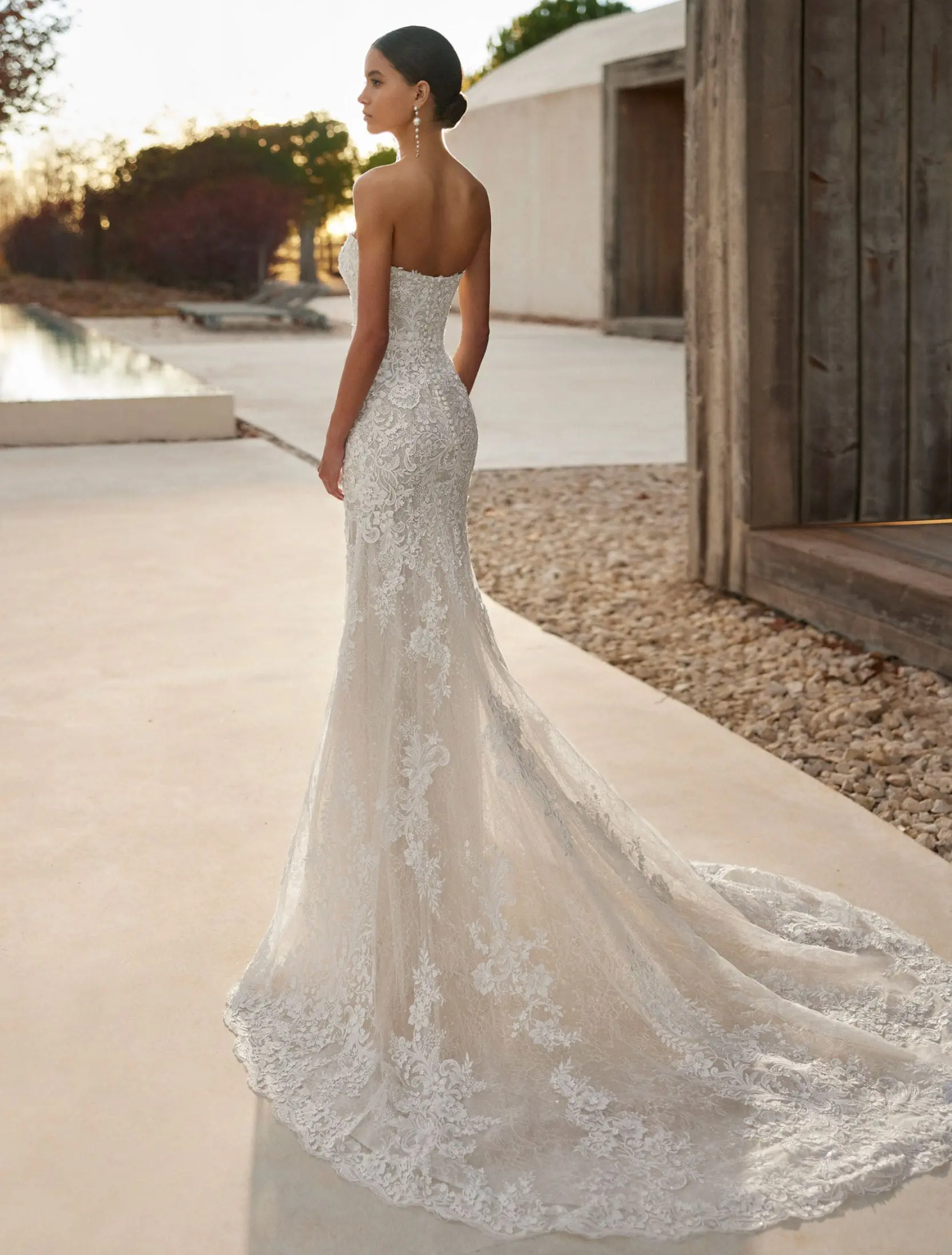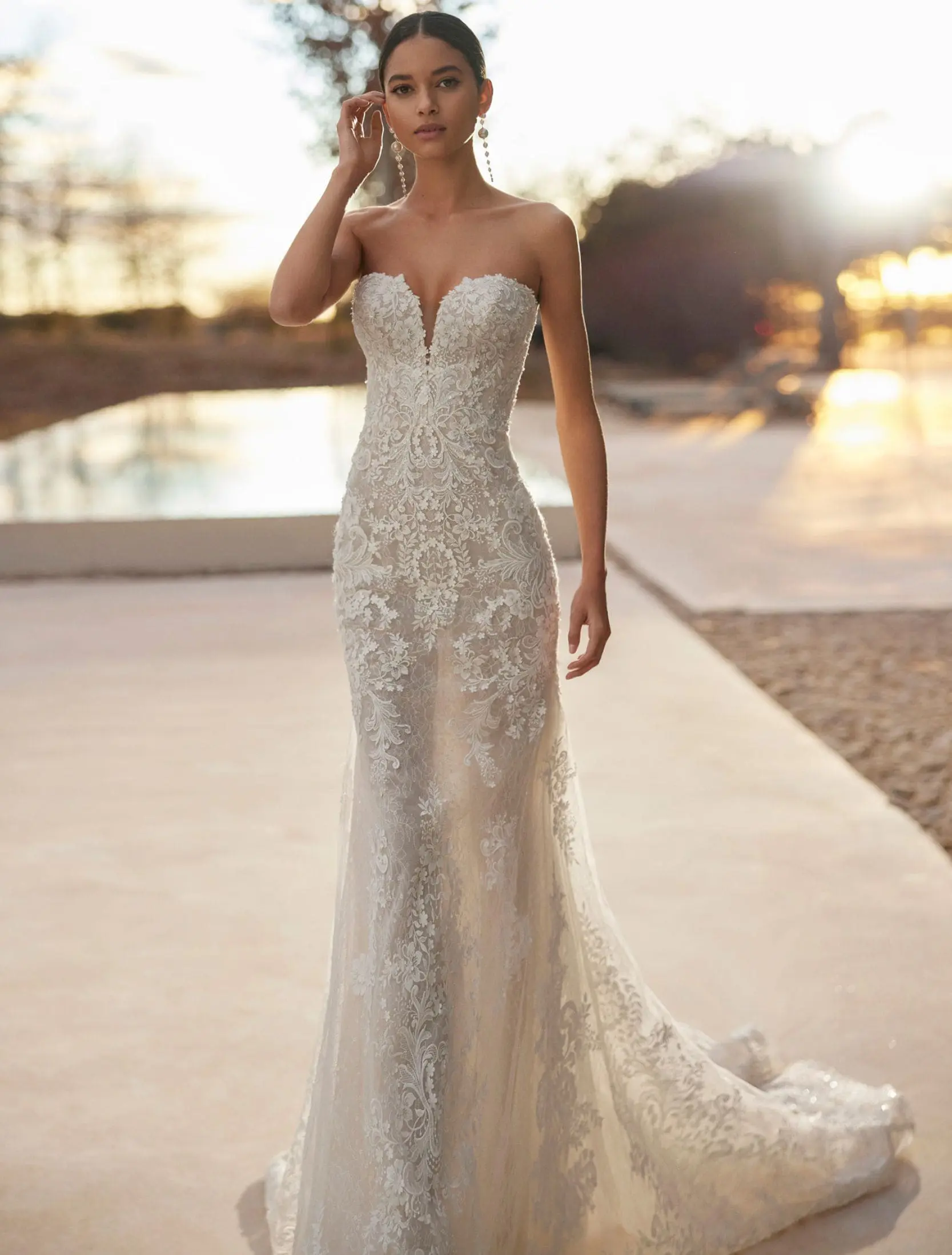 Robe de mariée deux pièces, à la coupe sirène et au style élégant, confectionnée en dentelle et ornée de perles. Elle se complète d’un décolleté cœur et d’une veste en tulle, sublimée de dentelle et de perles. Un ensemble de mariée Rosa Clará.