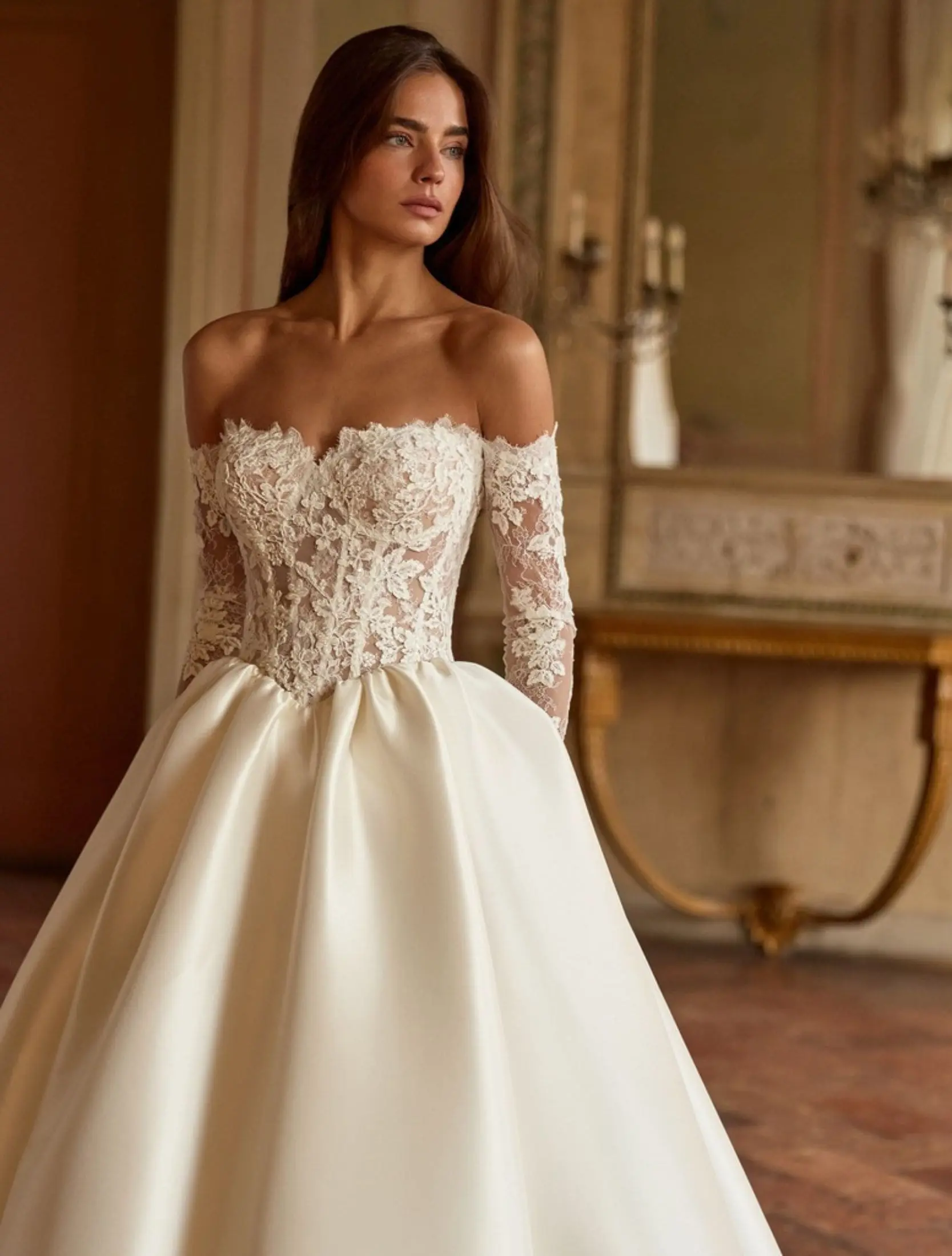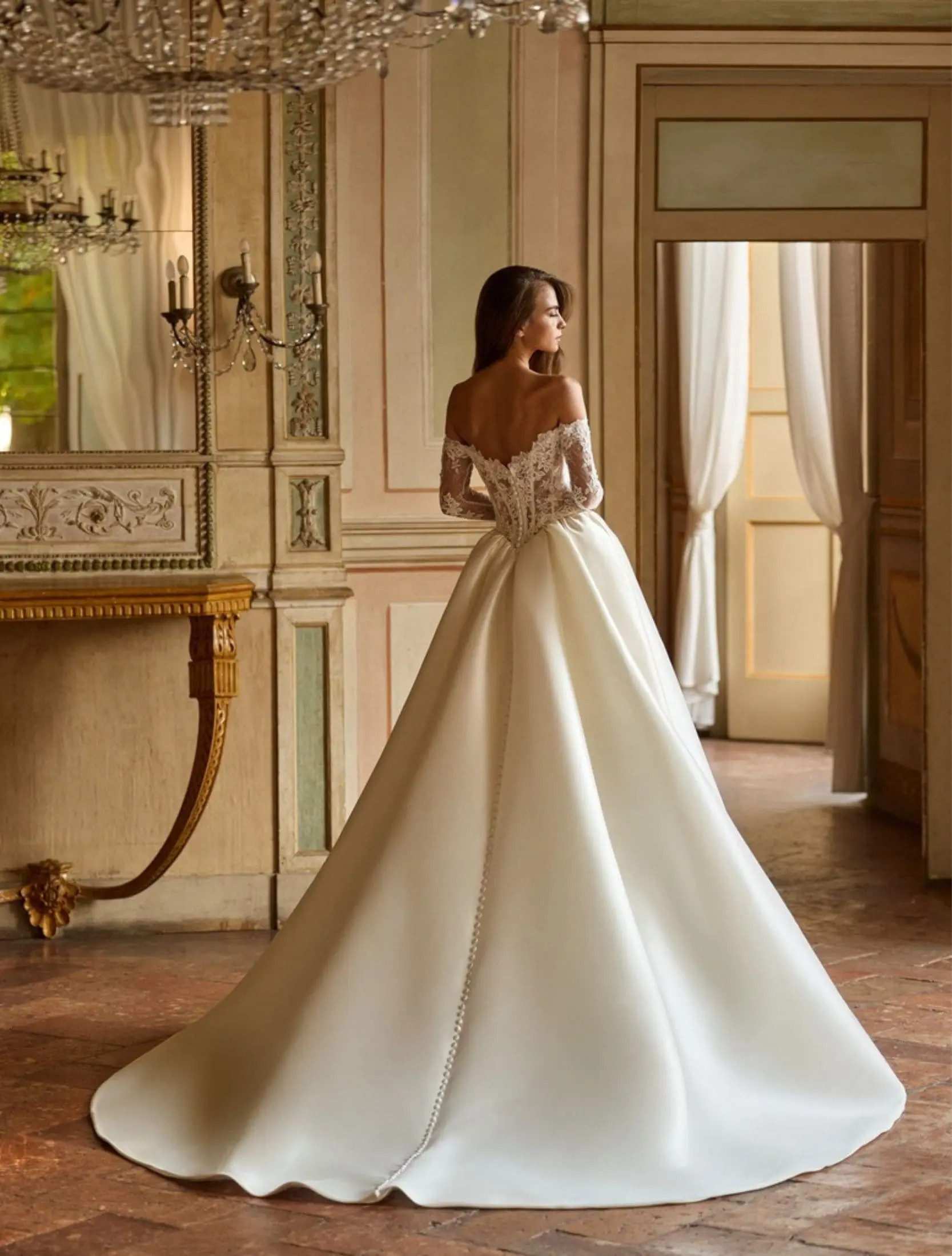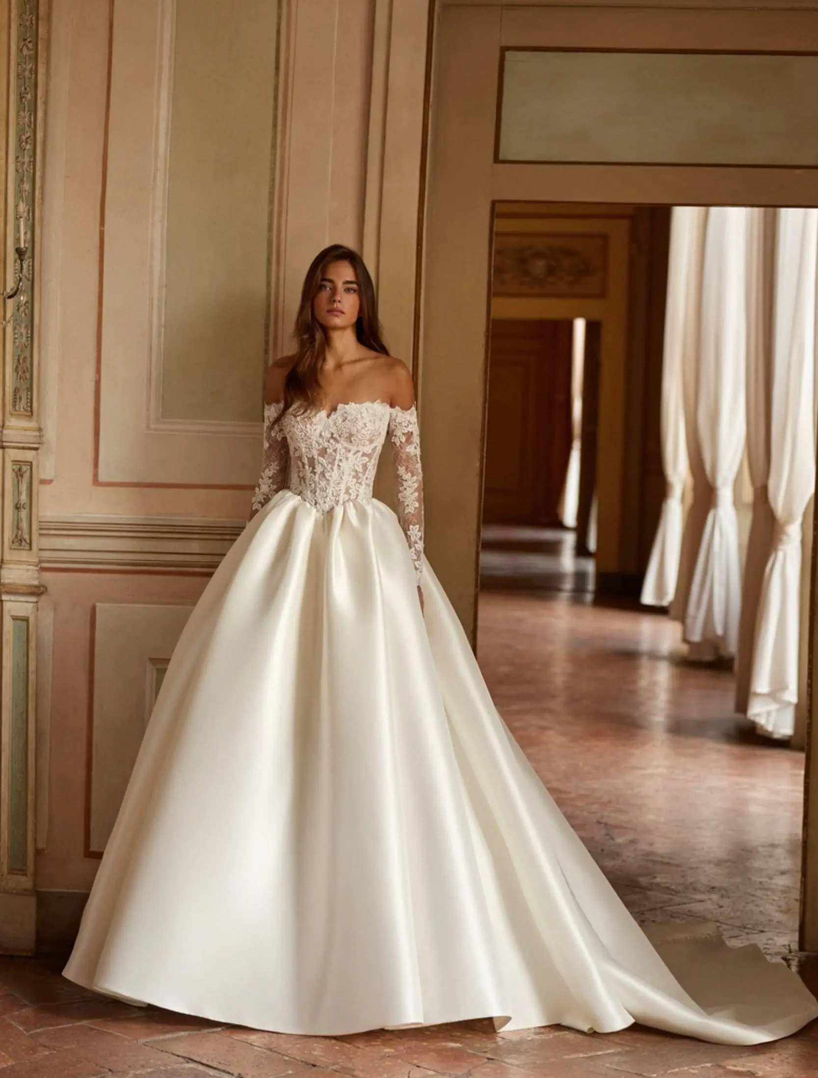 Robe princesse classique. Corsage structuré à décolleté enveloppant et manches longues, avec jupe volumineuse en mikado.