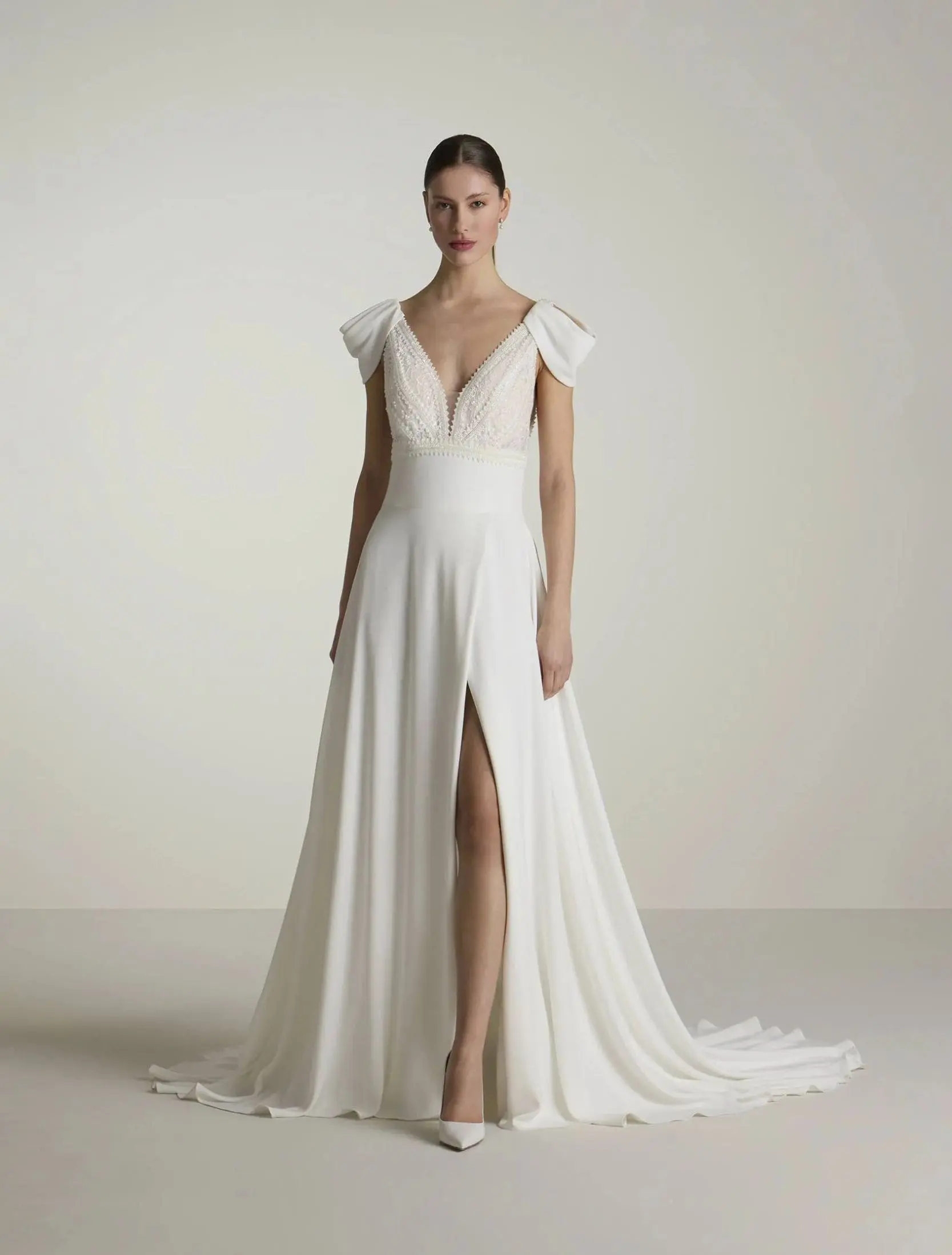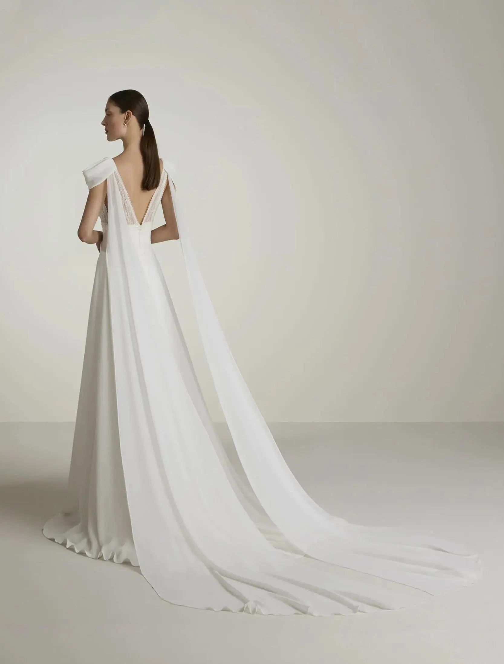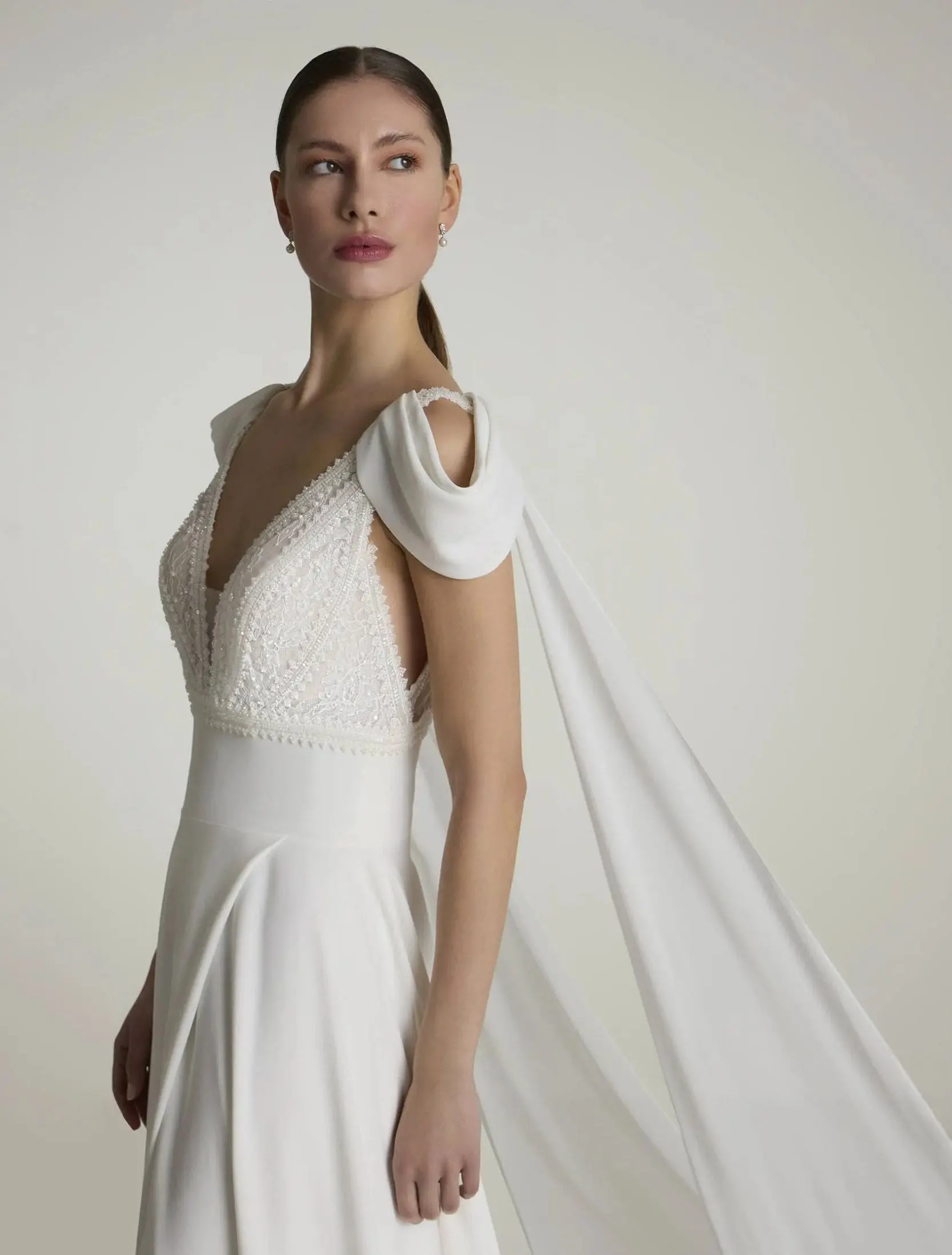 Robe de mariée coupe A-line en crêpe, dotée d’un corsage en dentelle et strass avec décolleté en V. La jupe fendue à taille haute s’accompagne de manches tombantes et d’une cape amovible façon traîne, offrant élégance et liberté de mouvement.