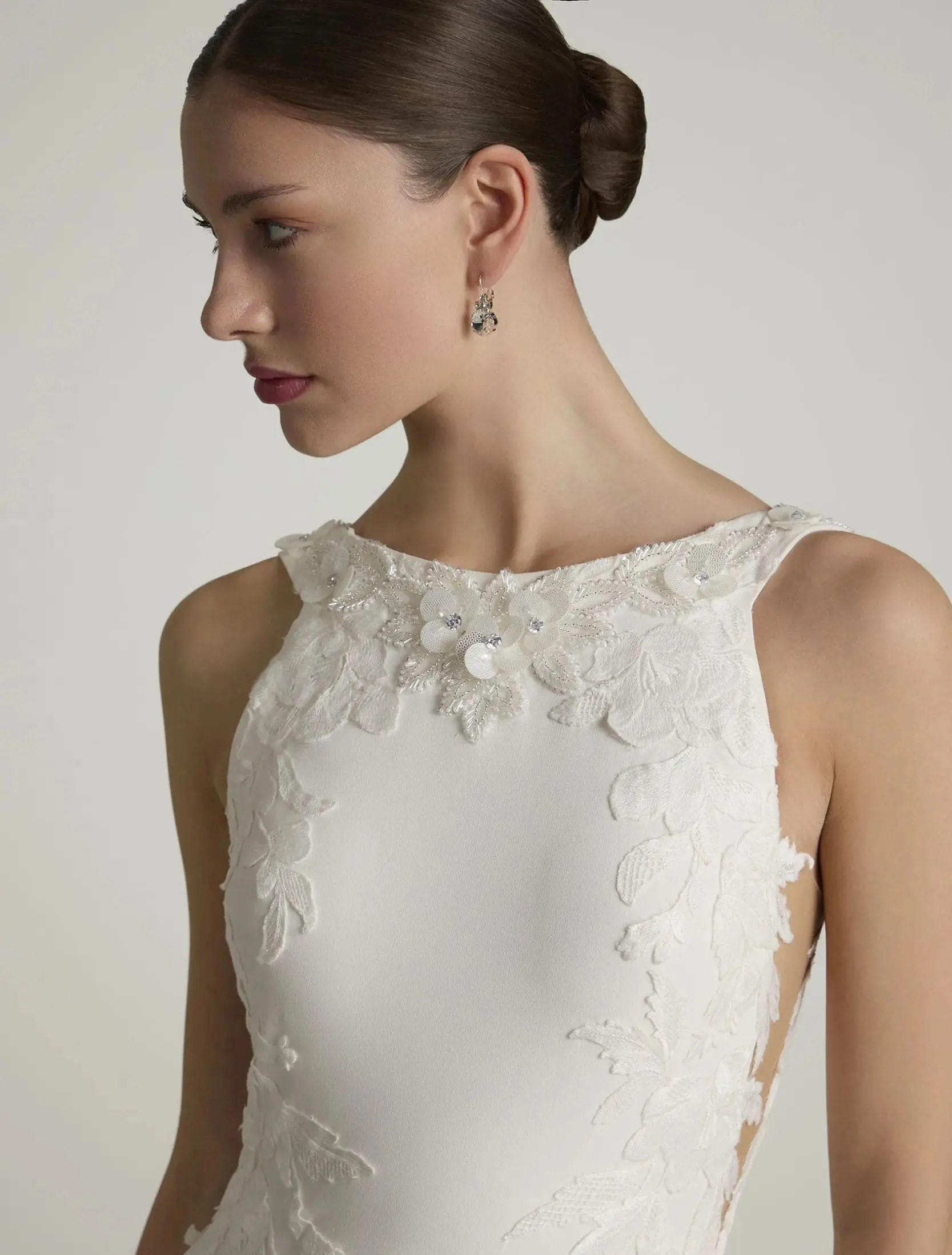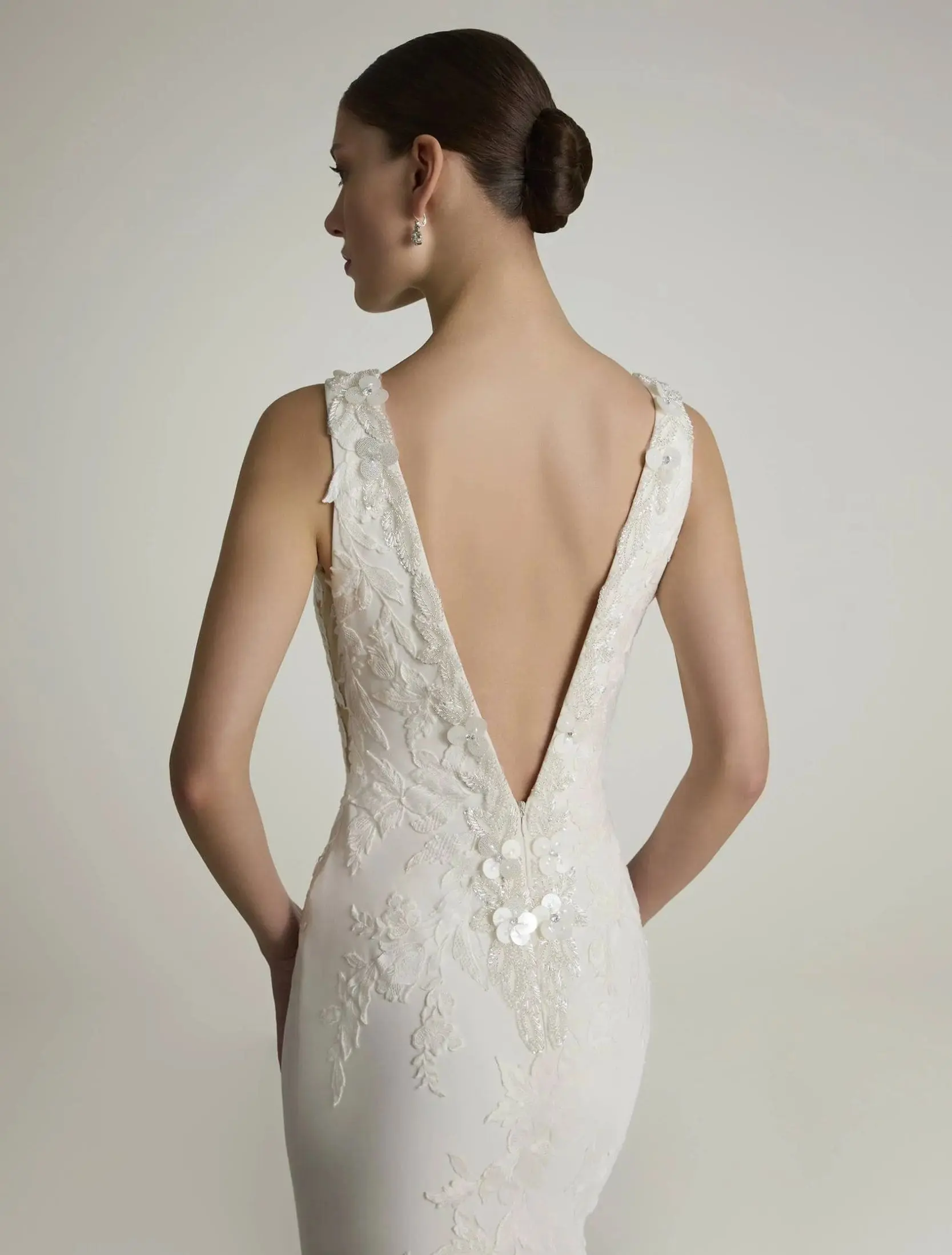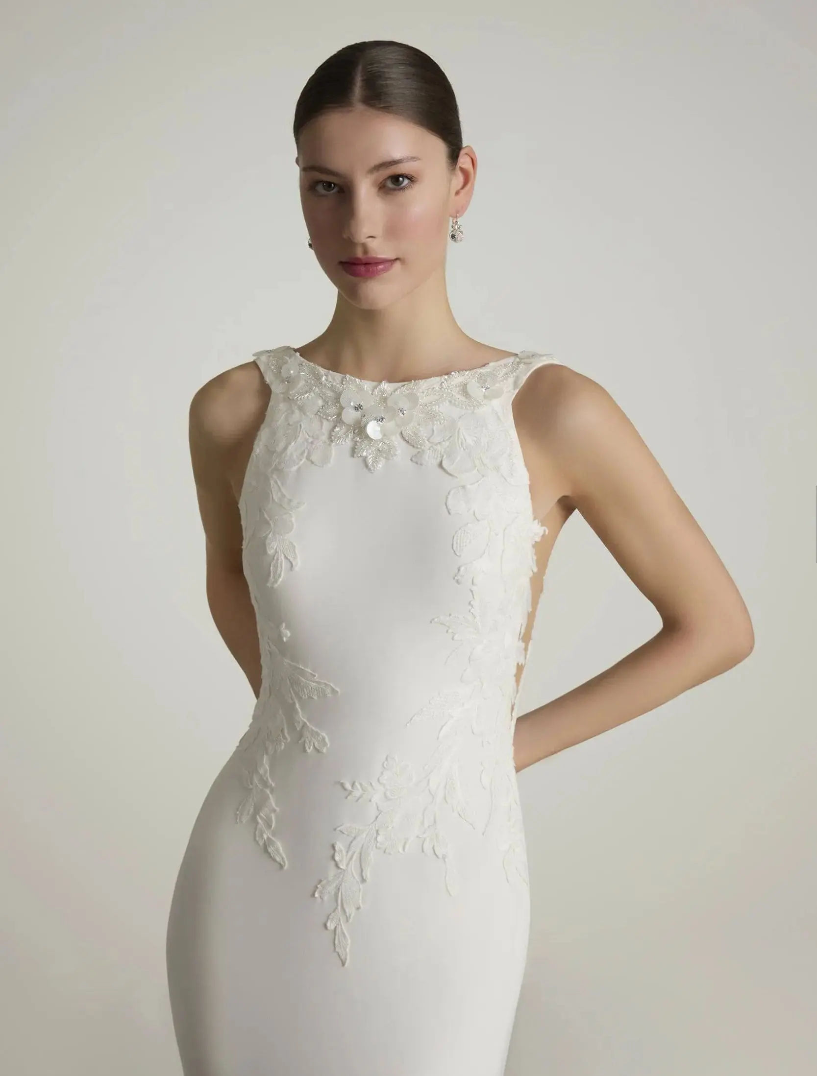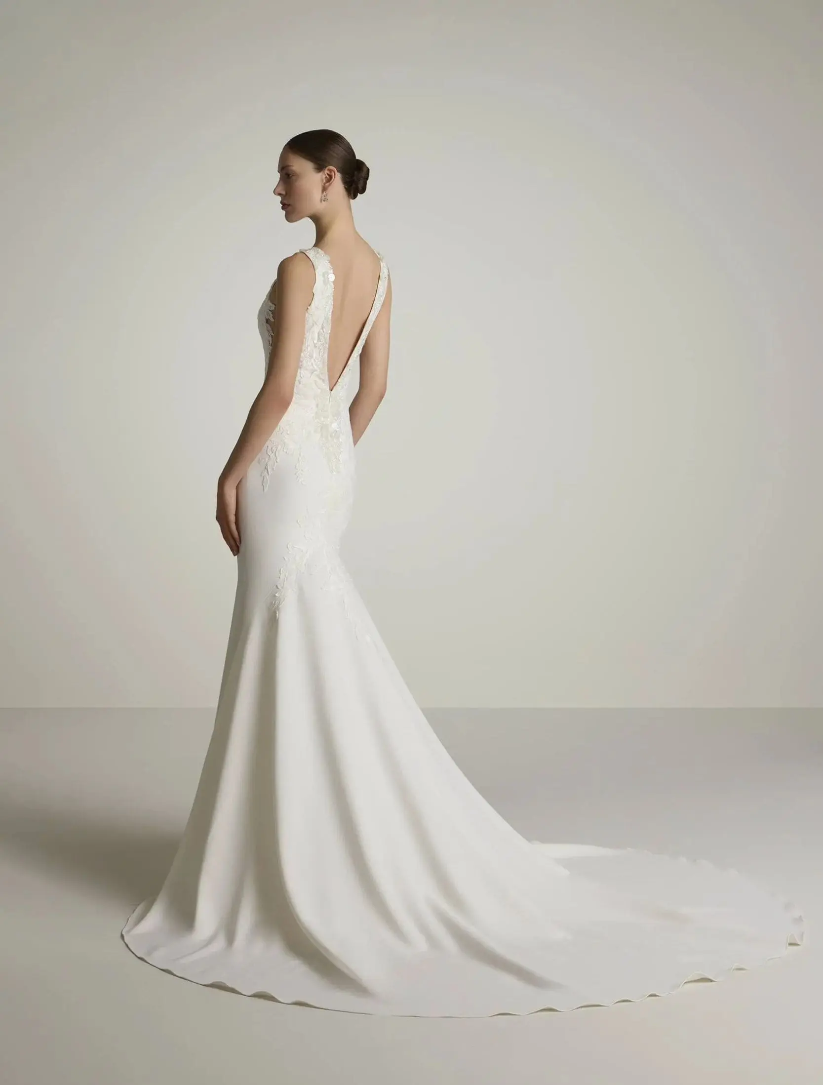 Robe de mariée sirène sensuelle en crêpe, avec décolleté bateau à l’avant et dos plongeant en V. Les détails de dentelle florale et de strass soulignent le corsage et épousent les courbes avec élégance pour une allure raffinée et féminine.