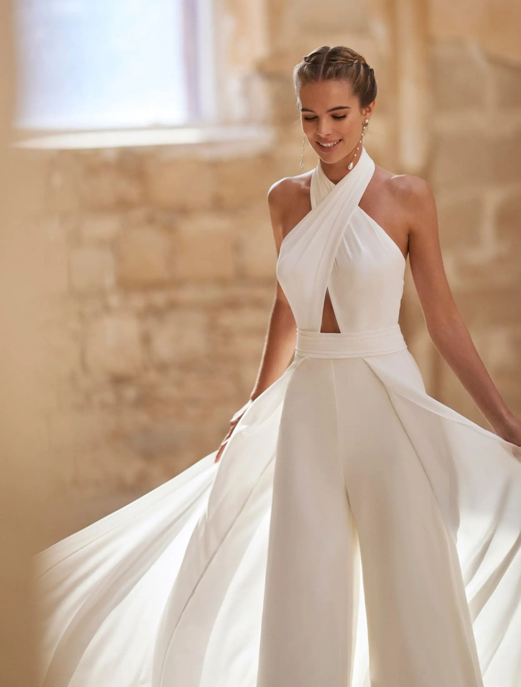 Tenue de mariée longue à la coupe droite et au style fluide et épuré, confectionnée en crêpe. Elle présente un décolleté dos nu halter et un dos échancré. Ce modèle est proposé en version pantalon ou en version robe. Une création Alma Novia au charme minimaliste.