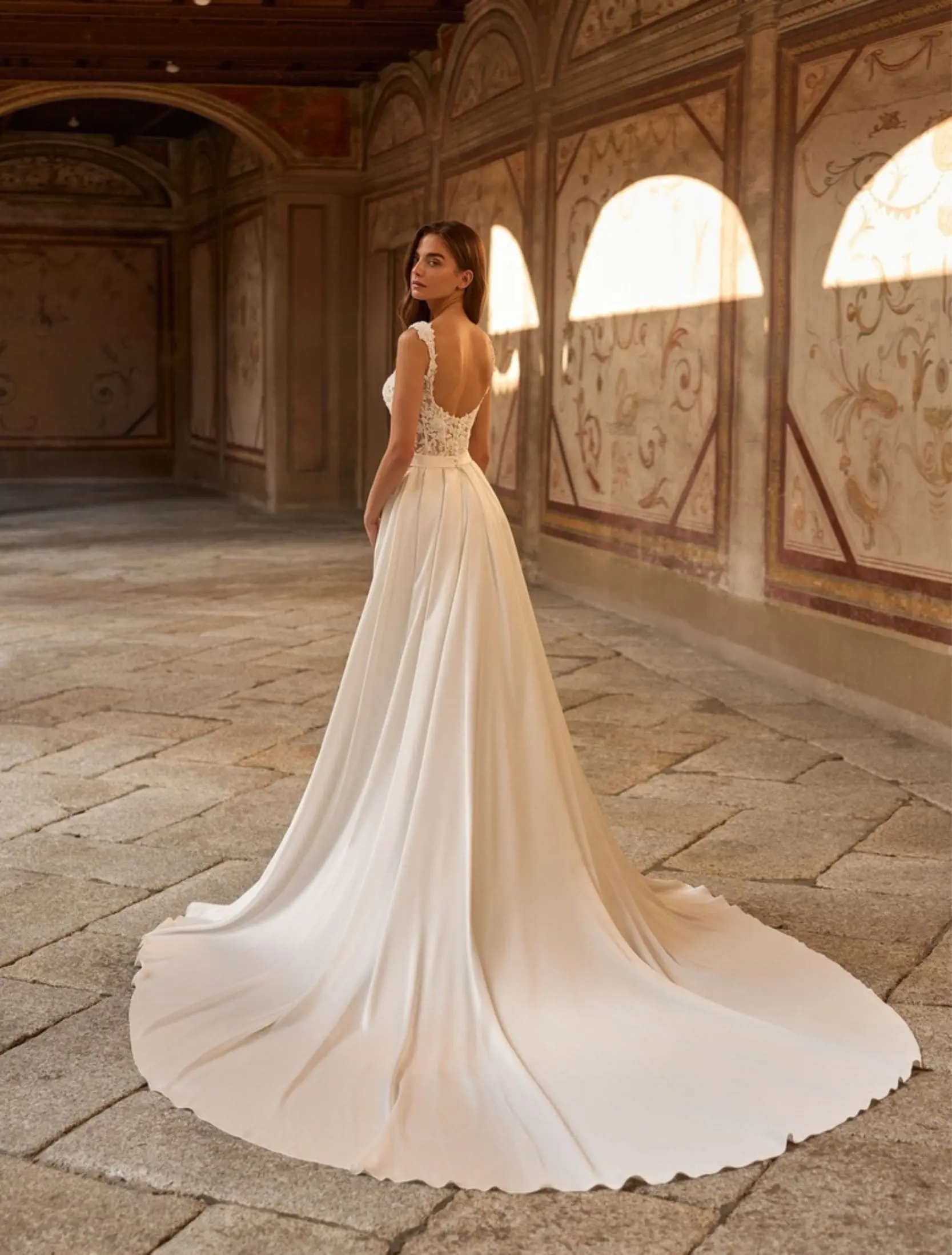 Robe de mariée sirène moderne avec corsage orné de perles et drapé en satin souple, associée à une jupe sirène en satin. Une surjupe amovible en satin complète le double look.