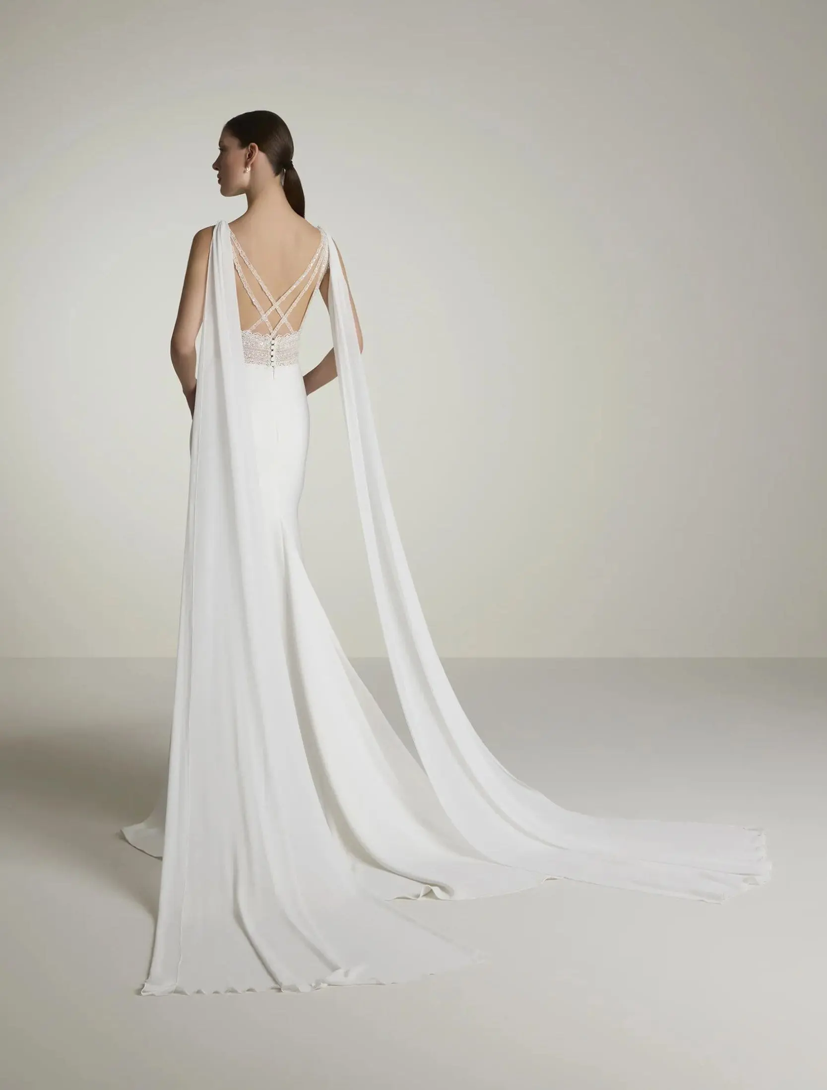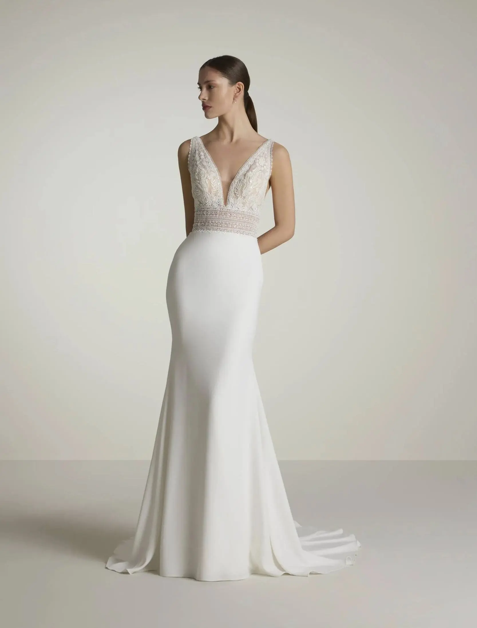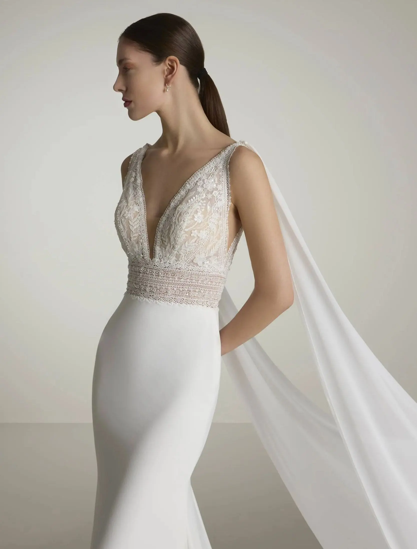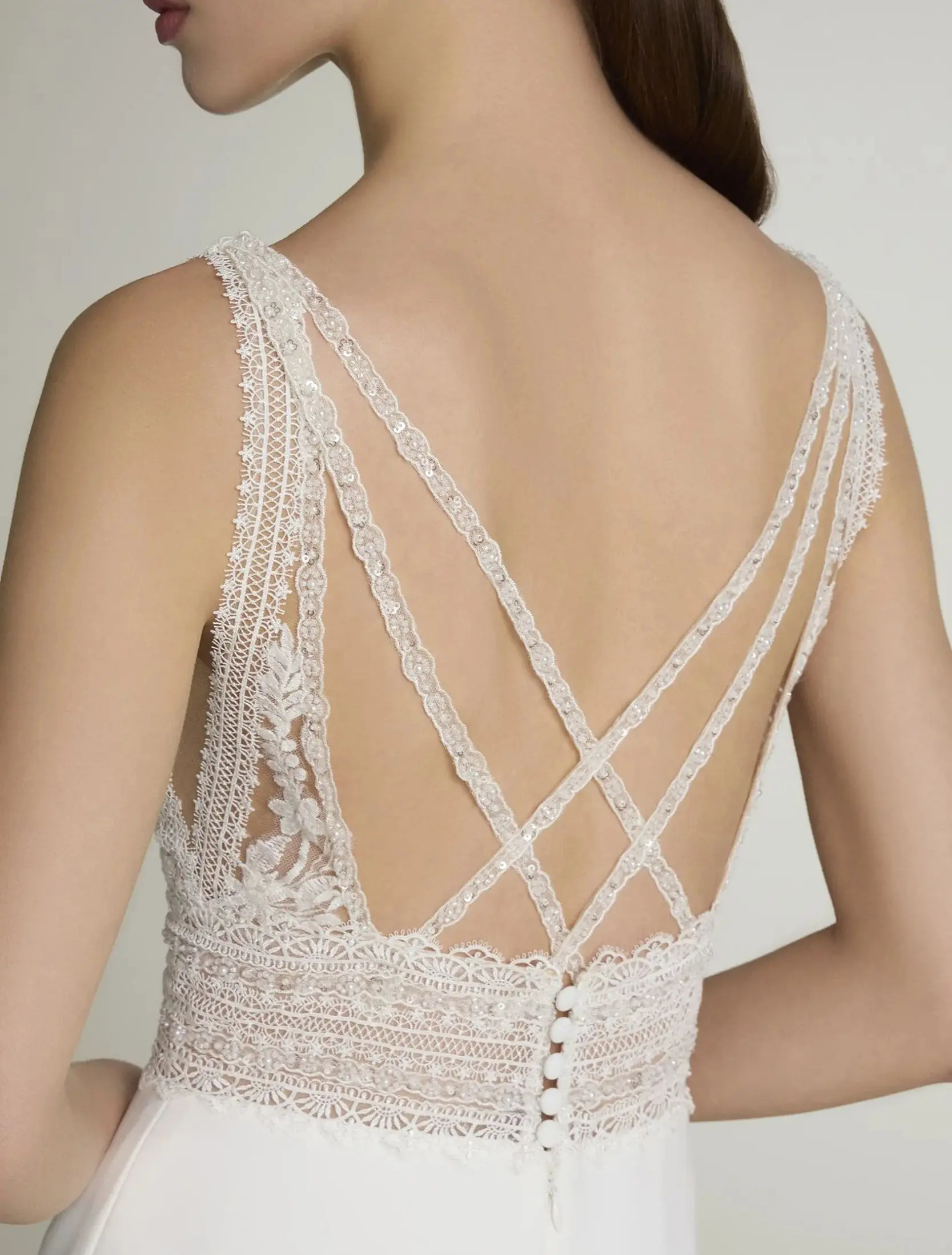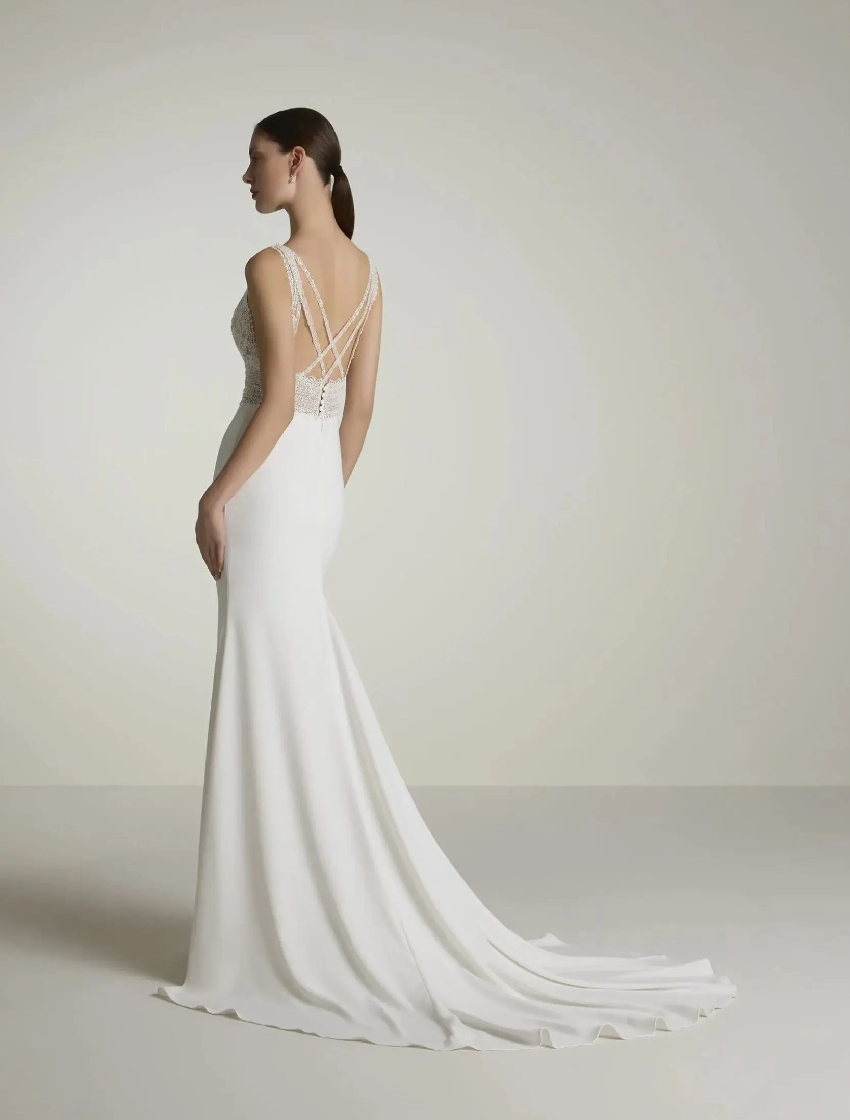Robe de mariée sirène au style sophistiqué et romantique, composée d’un corsage en dentelle et pierreries. Les doubles bretelles croisées dans le dos apportent du caractère, tandis que la jupe en crêpe souligne la silhouette et s’ouvre au niveau du genou.
