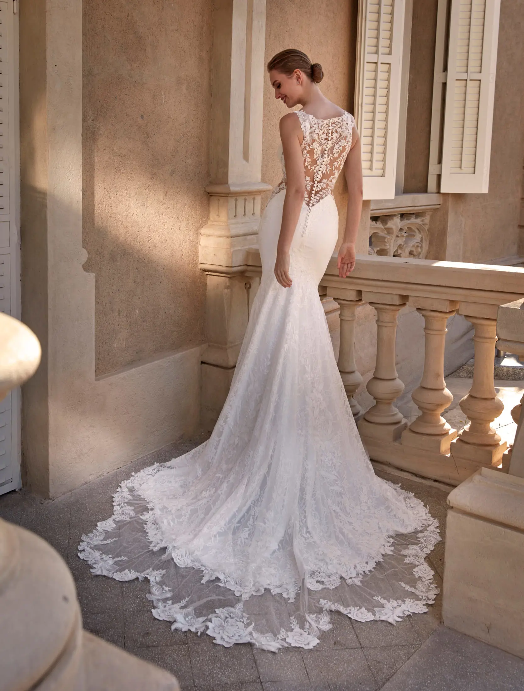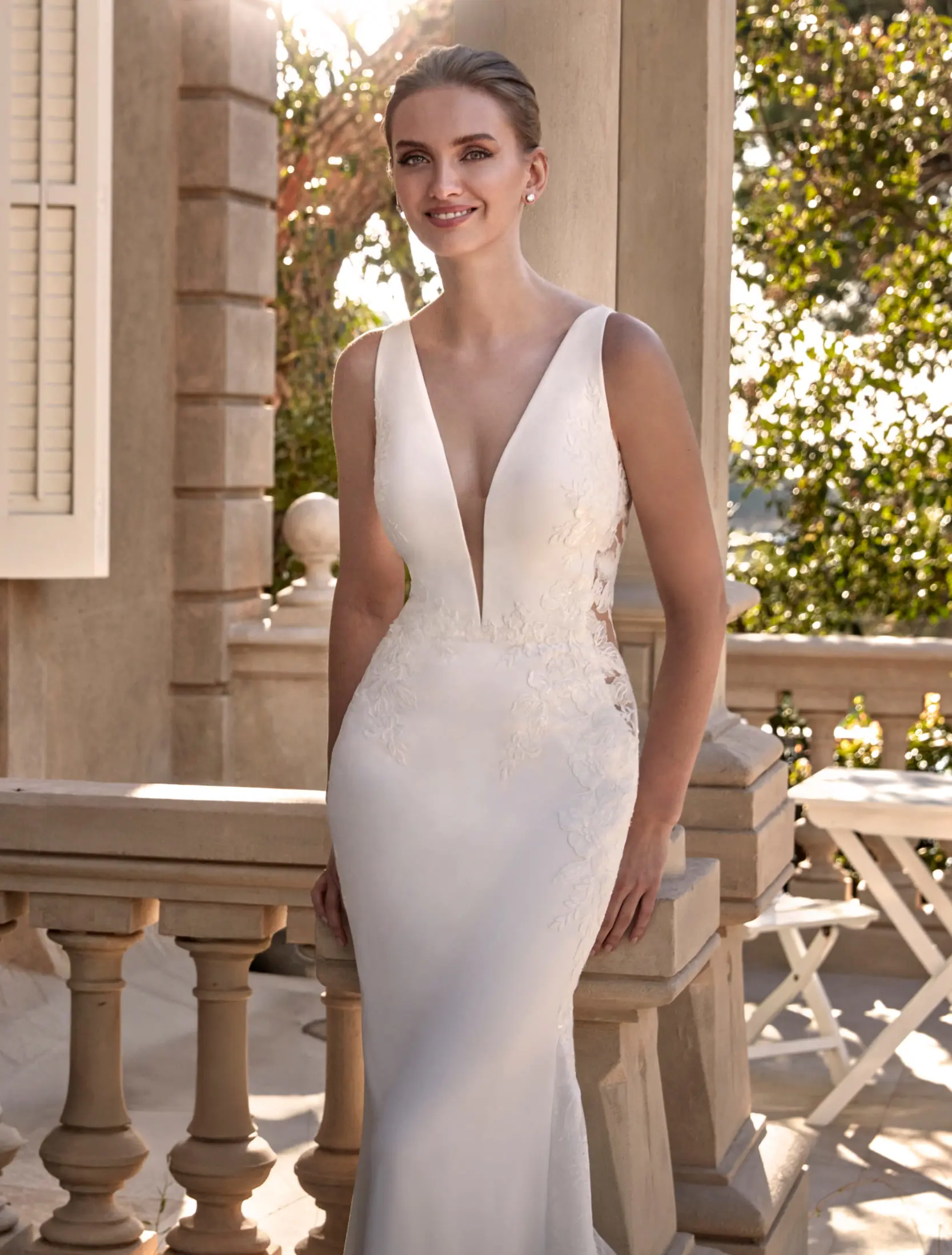 Robe sirène en crêpe avec dentelle, Chantilly et perles, décolleté V valorisant le buste avec raffinement.