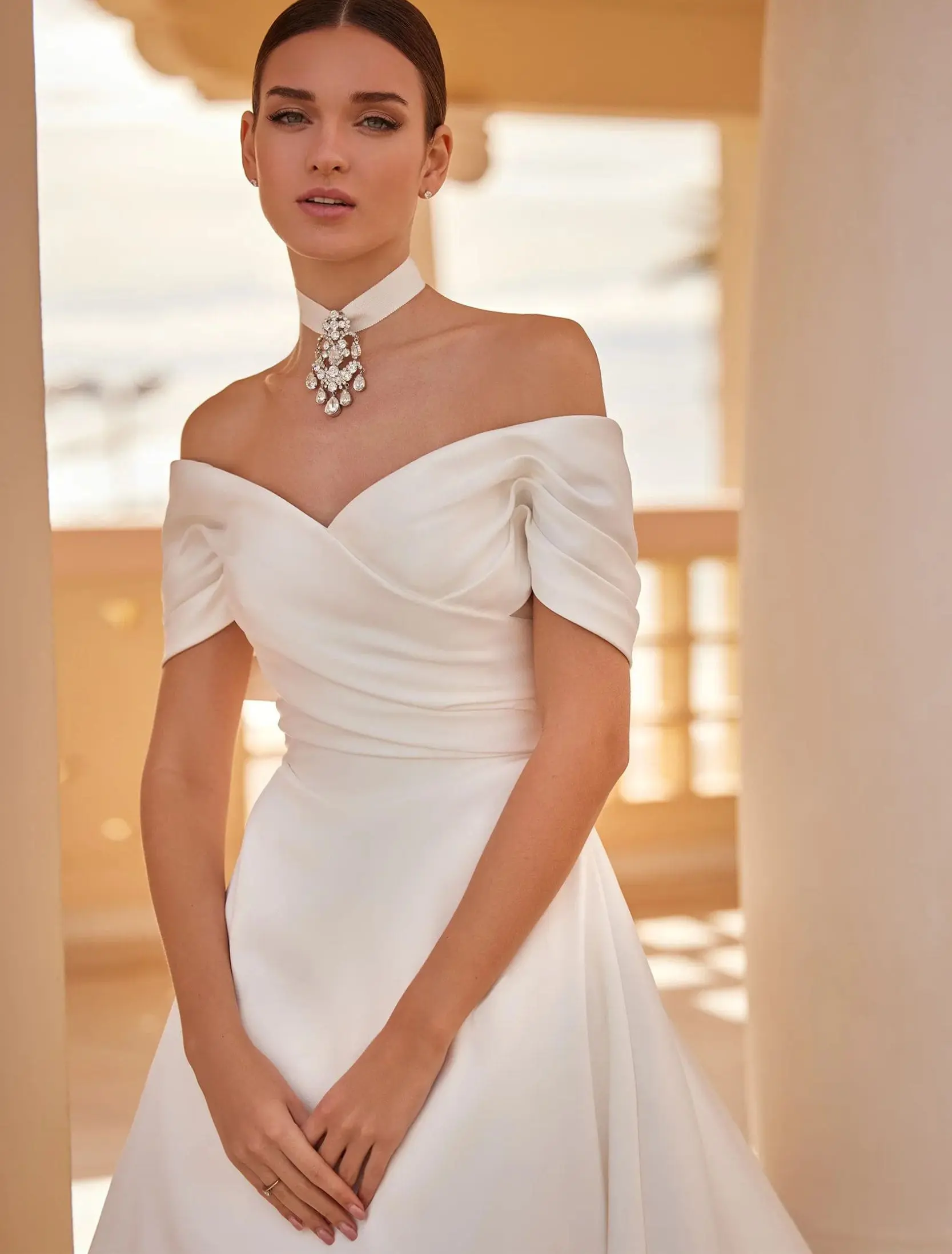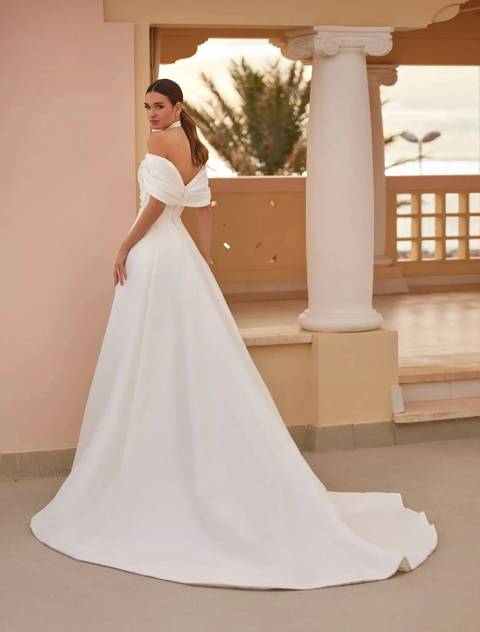Robe de mariée A-line en mikado, dotée de manches courtes. Un modèle épuré et élégant à l’allure intemporelle.