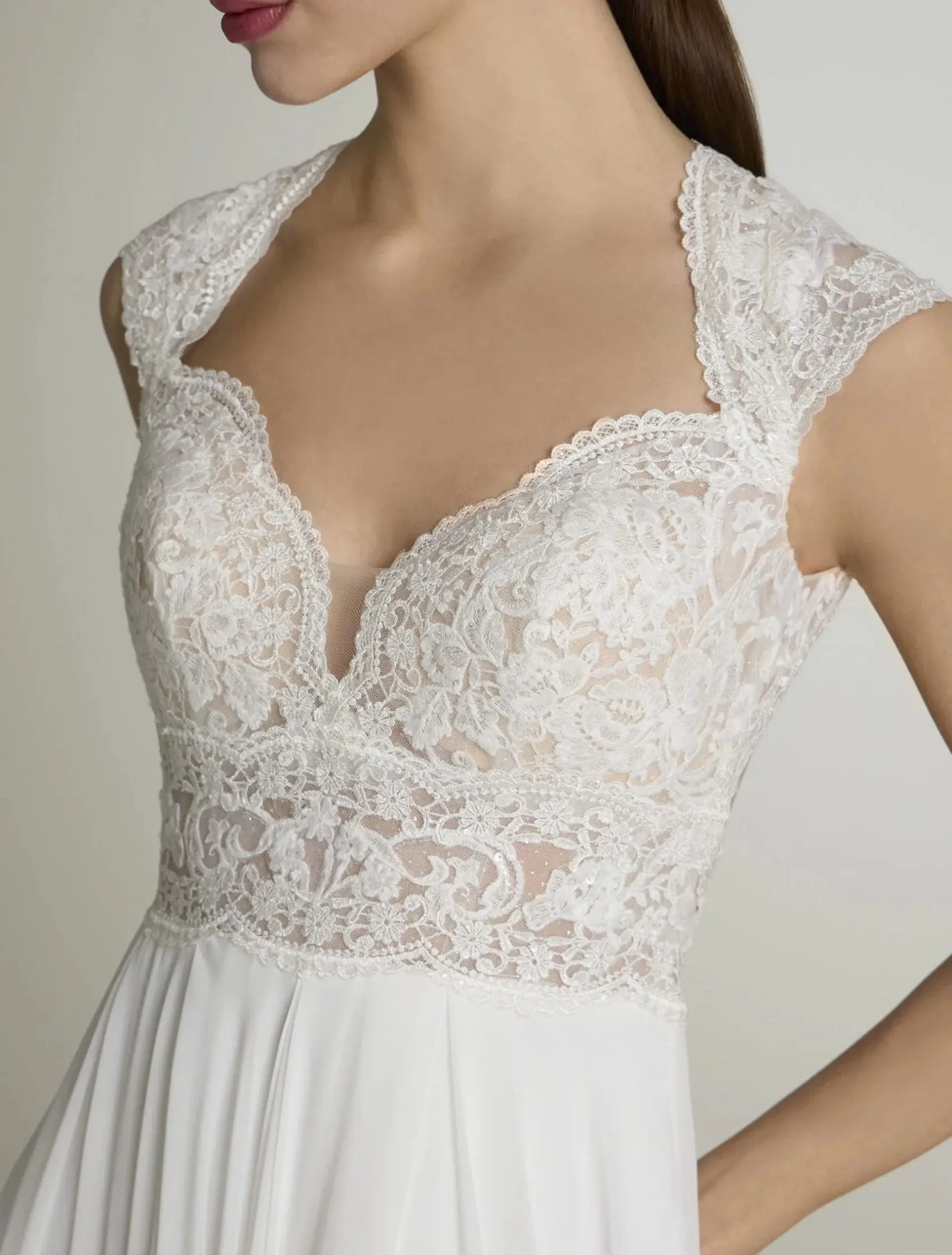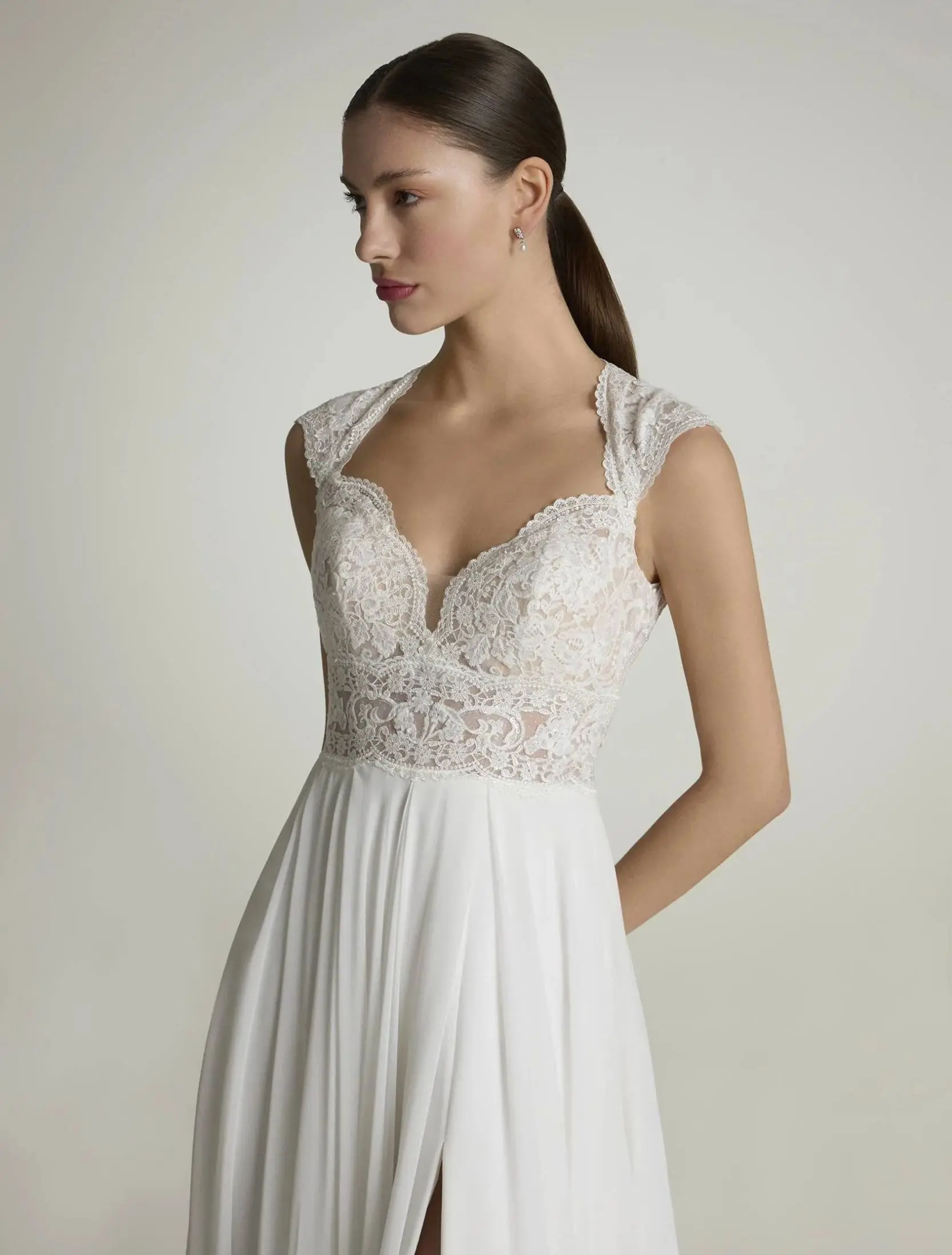 Robe de mariée romantique et élégante, au bustier cœur rehaussé de petites manches ornées de dentelle et de strass. La jupe en mousseline tombe délicatement depuis la taille, tandis qu’une fente jusqu’à mi-cuisse apporte une touche sensuelle à ce modèle raffiné.