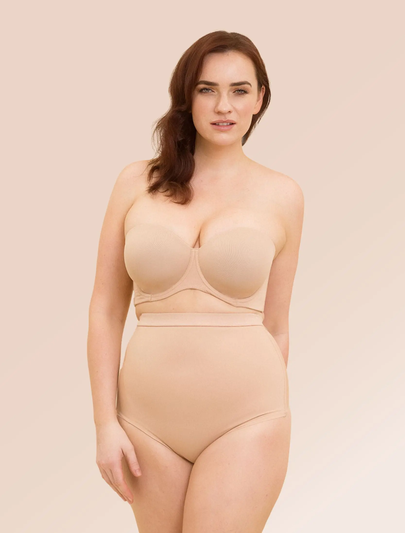 Soutien-gorge sans bretelles conçu pour les bonnets D à H. Livré avec des bretelles amovibles en satin et transparentes. Extendeurs inclus pour plus de confort. Tailles du 34 au 54/56. Disponible uniquement en coloris peau claire.